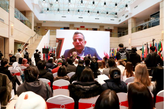 厄瓜多尔共和国前总统莱宁·莫雷诺先生、格鲁吉亚驻华大使 阿尔赤·卡岚第亚先生、埃及驻华大使阿塞姆·哈乃斐先生、萨尔瓦多驻华大使馆公参卡罗琳娜·萨拉尔女士、巴基斯坦驻华大使馆教育参赞阿菲法·沙加·阿瓦伊斯女士、南苏丹驻华大使馆文化参赞玛塔·阿布沙克女士、教育部中外语言交流合作中心交流处处长丁利国、全国政协委员、中央广播电视总台央视新闻主播、“汉语桥”冠军导师、北京语言大学特聘教授海霞、“汉语桥”俱乐部(广电教培基地站)站长李搏、北方昆曲剧院演员中心主任、国家一级演员杨帆先生、河北以岭医院治未病科主任中医师王卫国、中国航天科技集团五院天问一号火星探测器副总设计师贾阳及知名艺术家、当代箜篌传承人周珂、非遗传承人等中外嘉宾应邀出席活动。北京语言大学校长刘利、副校长张宝钧、学校办公室、发展规划处、宣传部、教师工作部、国际合作交流处、国际学生招生处、国际教育管理处、国际学生管理处、汉语进修学院、预科教育学院等相关部门负责人、老教师和专家代表,以及来自日本、俄罗斯、德国、意大利、乌干达等全球37个国家和地区的200多名中外学生共聚⼀堂,亲切互动,推动文明互鉴、民心相通。