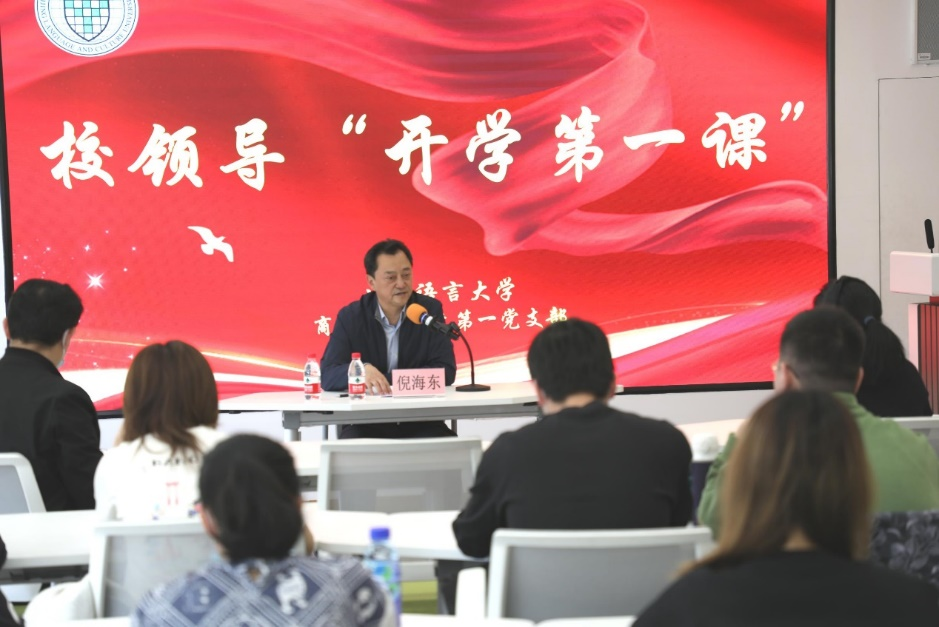 为深入学习贯彻习近平新时代中国特色社会主义思想和党的二十大精神,围绕立德树人根本任务,教育引导广大青年明确努力方向和奋斗目标,3月14日下午,校党委书记倪海东以“挺膺担当 接续奋斗 在新征程上跑出北语风采”为题,为商学院学生讲授了“开学第一课”。商学院党委书记张政、党委副书记王慧媛与同学们一同聆听了这堂精彩生动的“大思政课”。