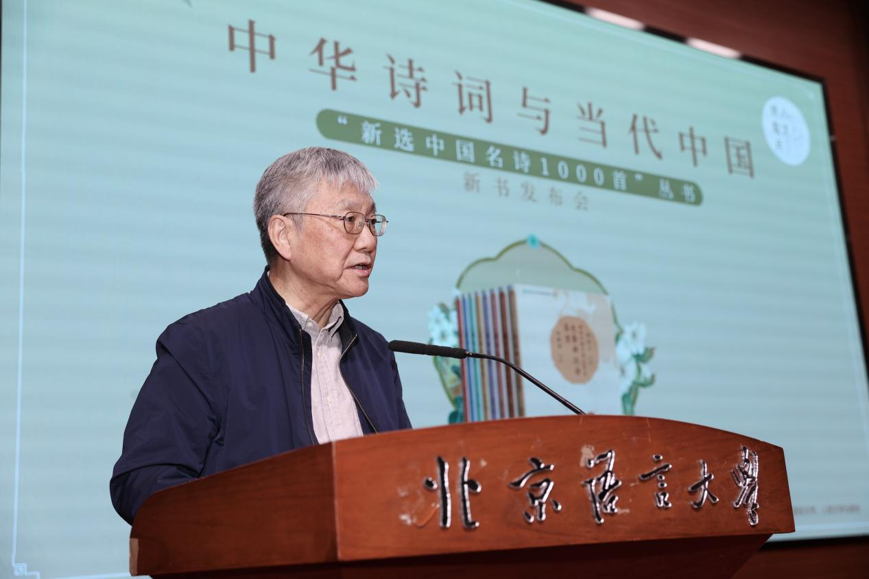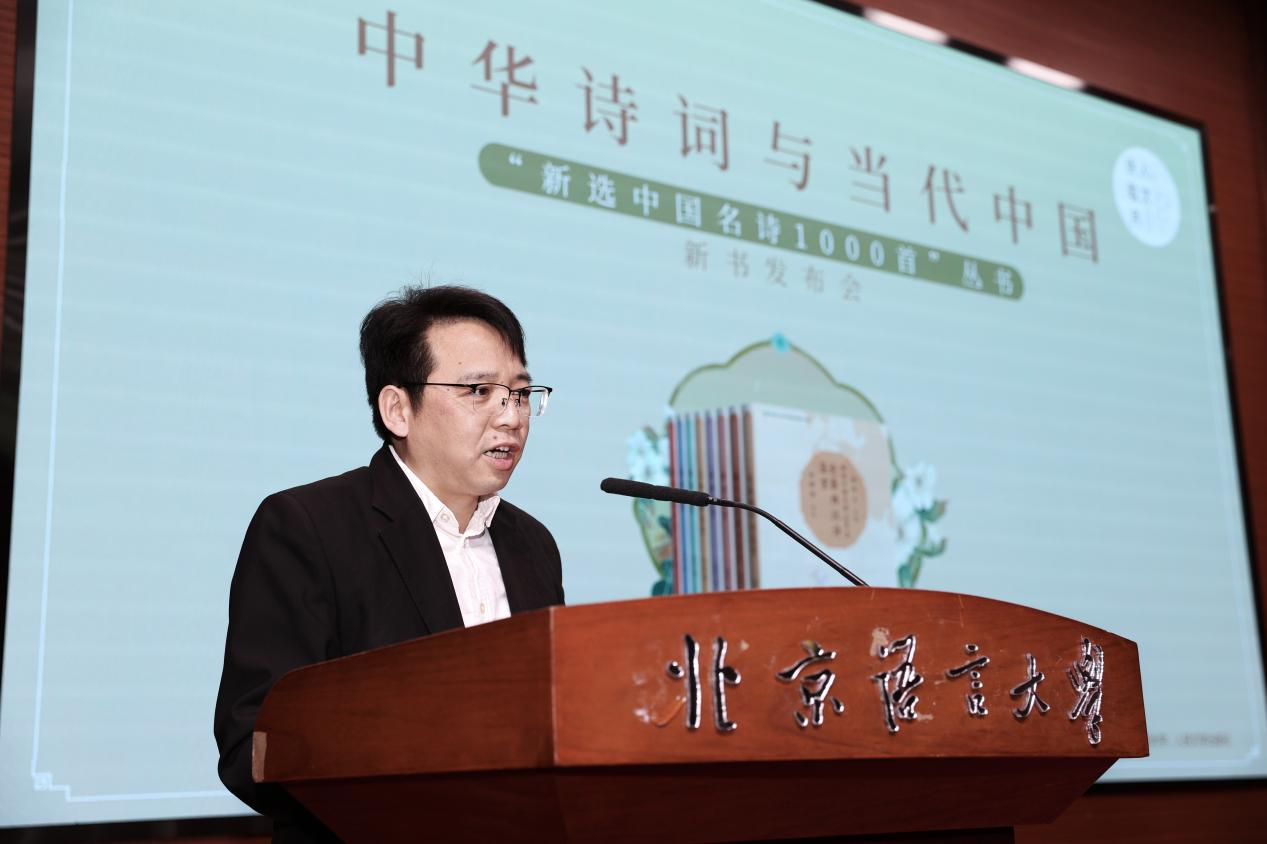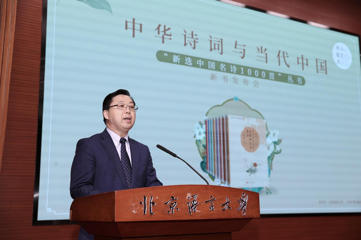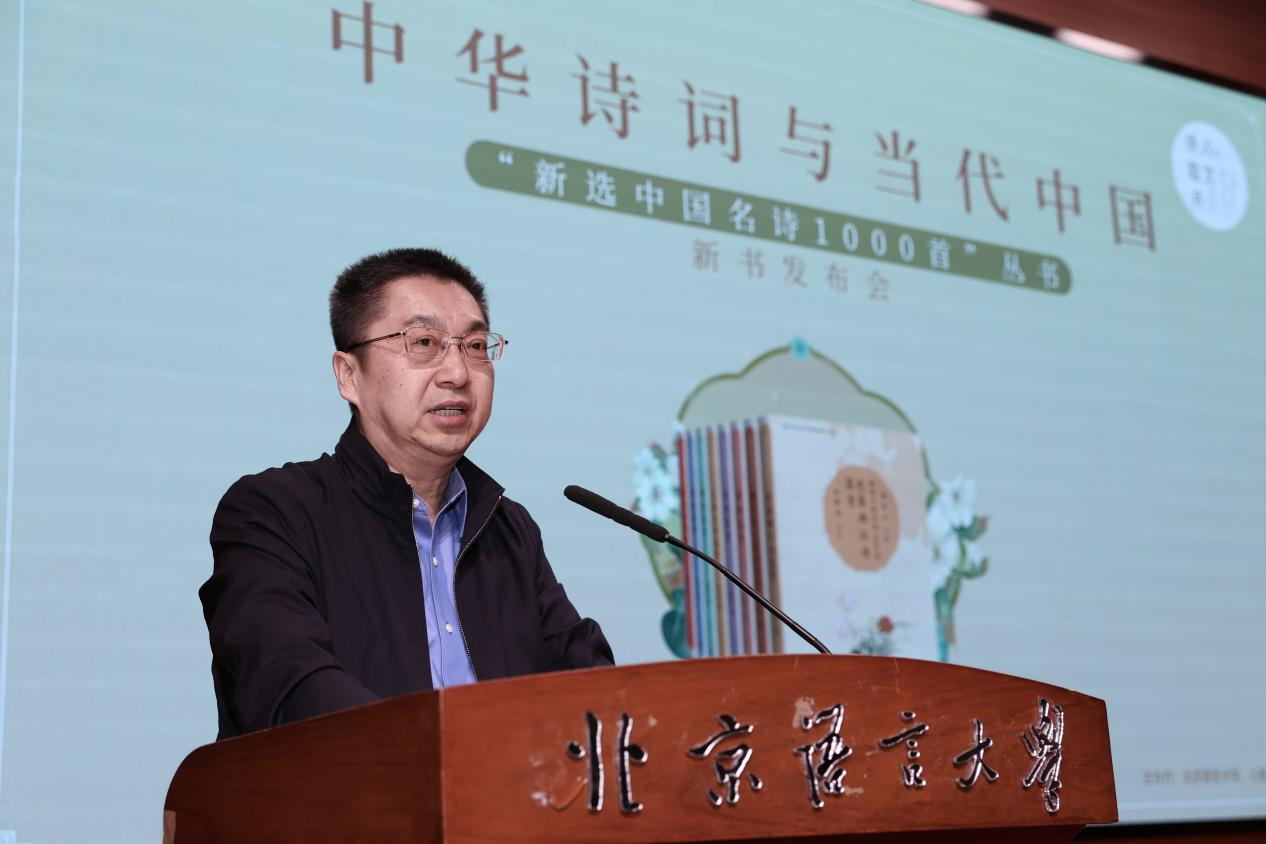 北京语言大学校长刘利教授在致辞中指出, “新选中国名诗1000首”丛书的发布是北京语言大学和人民文学出版社共同贯彻落实党和国家文化战略的重要举措,也是向社会大众奉献的一套雅俗共赏的普及读本。丛书主编和八位作者既是当今品德高尚的人师,又是造诣精深的学问大家,是中央一再强调和表彰的“大先生”。由他们撰写各自研究领域的诗歌鉴赏读本,保证了丛书质量的高水准。“新选中国名诗1000首”的出版,有助于讲好中国故事,传播好中国声音,展现可信、可爱、可敬的中国形象。当今时代,中国正走向世界舞台的中央,承担着更加重大的责任和使命,面对瞬息万变的世界局势和时代潮流,更加需要中华诗词所强调的开放包容、创新进取、和谐共生的精神和思想,努力让中华诗词在世界文化的舞台上展现出更加灿烂的光彩,为世界文化的多元化和交流贡献我们中华民族的独特智慧和创造力。