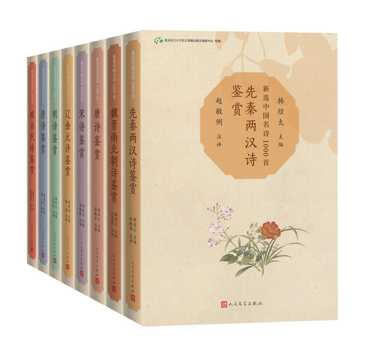 “新选中国名诗1000首”共8本,是由北京语言大学语言资源高精尖创新中心组织编写,韩经太教授担任主编,邀请葛晓音、莫砺锋、赵敏俐、钱志熙、张晶、左东岭、蒋寅、张福贵8位著名学者撰写的一套诗歌鉴赏读本。精选中国诗歌史上最经典的1000首名诗(唐宋各200首,其他时代各100首),予以简明准确的注释和专业独到的鉴赏,力求发掘每首名诗的思想境界和艺术魅力。