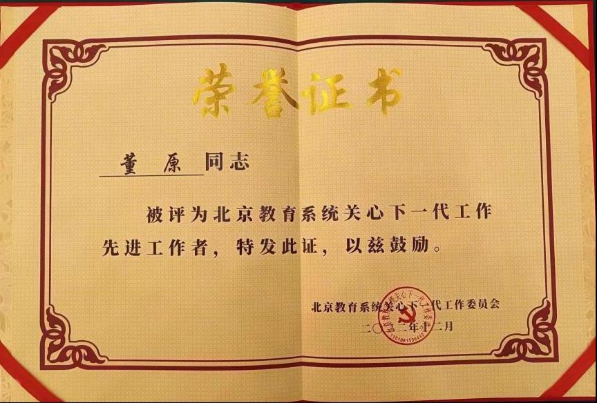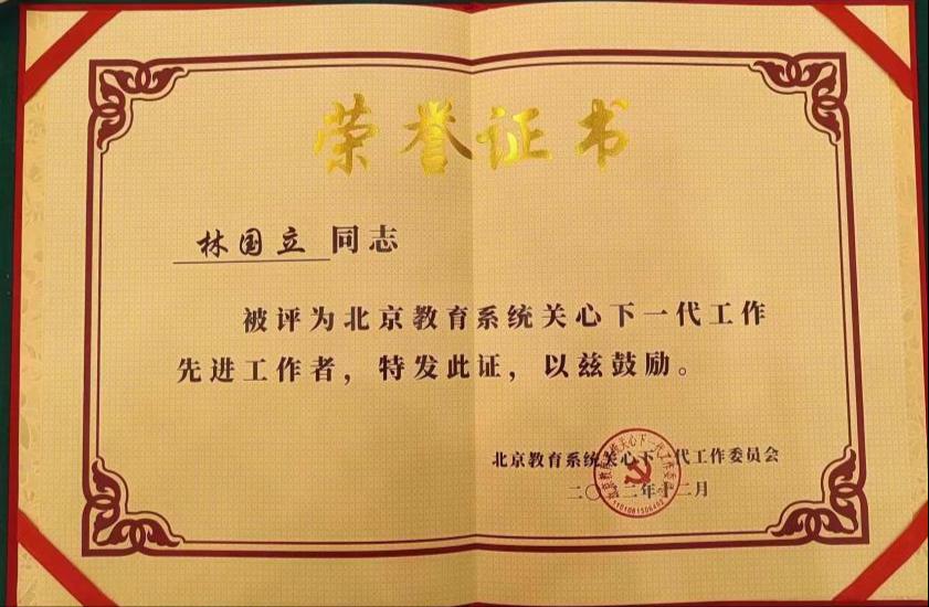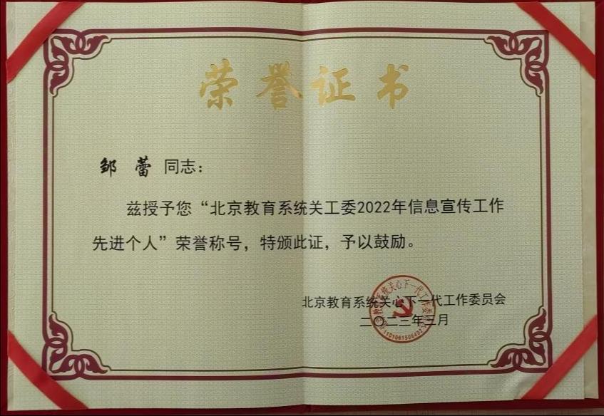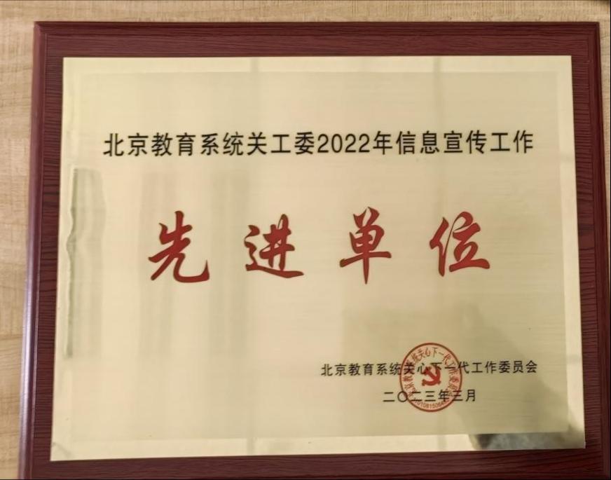 我校关工委荣获“北京教育系统关工委2022年信息宣传工作先进单位”称号。关工委常务副主任林国立、专职委员董原被评为北京教育系统关心下一代工作先进工作者。邹蕾同志荣获“北京教育系统关工委2022年信息宣传工作先进个人”称号。