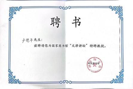 国家图书馆文津讲坛是由著名学者任继愈先生提议而设,是国家图书馆的文化品牌活动,每周邀请海内外知名专家作专题讲座,至今已面向社会开讲千余期,卢德平教授2023年受聘为国家图书馆文津讲坛特聘教授,成为该讲坛的重要专家。