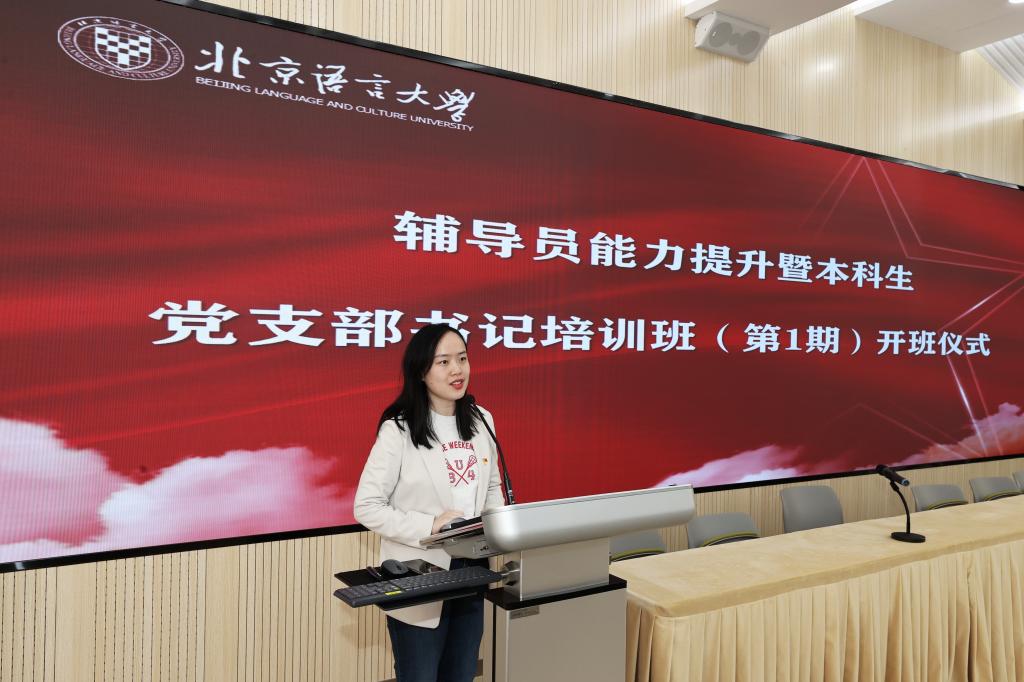 开班仪式上,武玉洲副部长介绍了本期培训班的背景和具体安排。本期培训班共设30个学时,其中线上16学时,线下14学时,考虑到辅导员工作年限不同、所属学院情况不同、面对的学生群体不同,培训课程采用选修制,大家根据自己的实际情况选修相应课程,完成规定学时。课程采用线上学习与线下学习相结合、理论培训与业务培训相结合、专题讲座与经验分享相结合、课堂学习与户外拓展相结合的方式进行,聚焦辅导员素质与能力提升,紧密围绕学生思想政治工作实际需求,设置党的二十大精神学习、习近平新时代中国特色社会主义思想学习教育、师德师风建设、学生党建、共青团工作、就业指导、心理健康教育、学位与研究生教育、辅导员职业发展等专题。外国语学部英语学院辅导员高睿璇和语言科学院辅导员王紫妍作为辅导员代表发言,表示将充分利用此次培训学习的机会,增强自身专业素养,提升职业能力,学以致用,努力成为一名合格的辅导员。