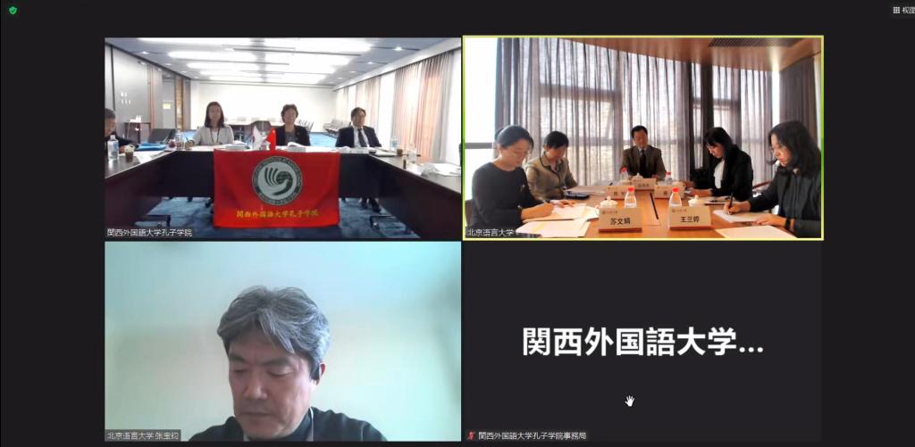 北京时间3月30日下午,日本关西外国语大学孔子学院第14届理事会以视频会议的方式顺利召开。校党委书记倪海东、副校长张宝钧、孔子学院工作处副处长苏文娟、日本关西外国语大学理事长谷本荣子、短期大学校长谷本和子、孔子学院日方院长靳卫卫、中方院长陈军等理事会成员以及两校相关部门负责人参加会议。