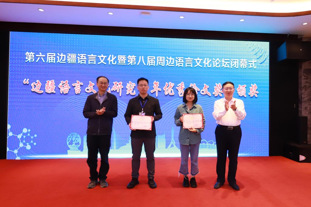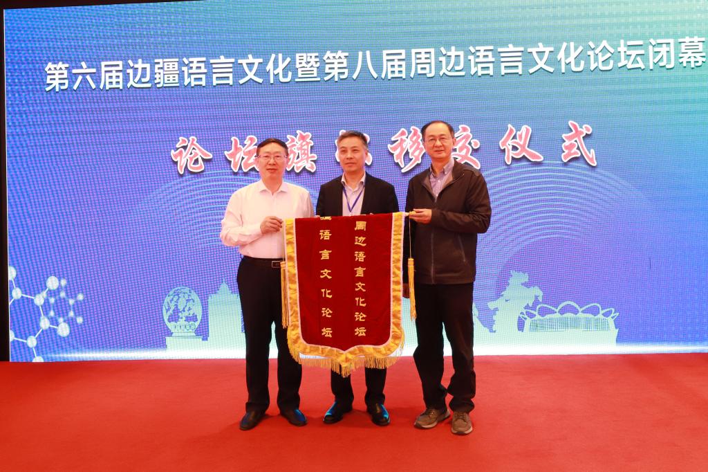 会议闭幕式由中央民族大学李锦芳教授主持。闭幕式上,论坛组委会为24名“边疆语言文化研究青年优秀论文奖”获奖者颁奖。广西民族大学文学院副院长康忠德作大会总结。会议决定2024年“第七届边疆语言文化暨第九届周边语言文化论坛”由喀什大学承办,喀什大学中国语言学院党委书记李少平与本届论坛主办方领导举行了会旗交接仪式。