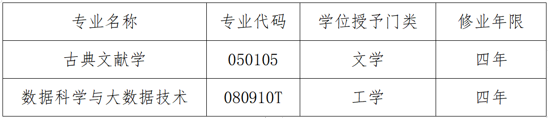 4月17日,教育部发布了《教育部关于公布2022年度普通高等学校本科专业备案和审批结果的通知》(教高函〔2023〕3号),学校申报的古典文献学、数据科学与大数据技术两个新专业获准增设,专业布局进一步优化。至此,学校本科专业增至44个,涵盖文学、理学、工学、经济学、管理学、法学、教育学、历史学、艺术学等9个学科门类、17个专业大类,其中,基本目录专业35个,特设专业6个,国家控制布点专业3个。