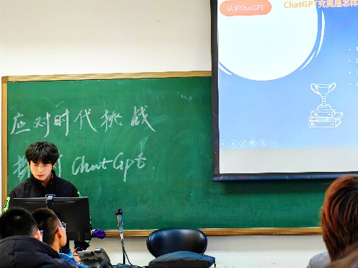 在主题探讨环节,班长朱光坤从认识ChatGPT、应对“强”人工智能时代挑战、启示和未来期望四个方面展开介绍。期间同学们认真听讲、各抒己见、质疑辨惑,推动活动顺利进行,展现信科学子积极求知,勇于探索的自信风貌。