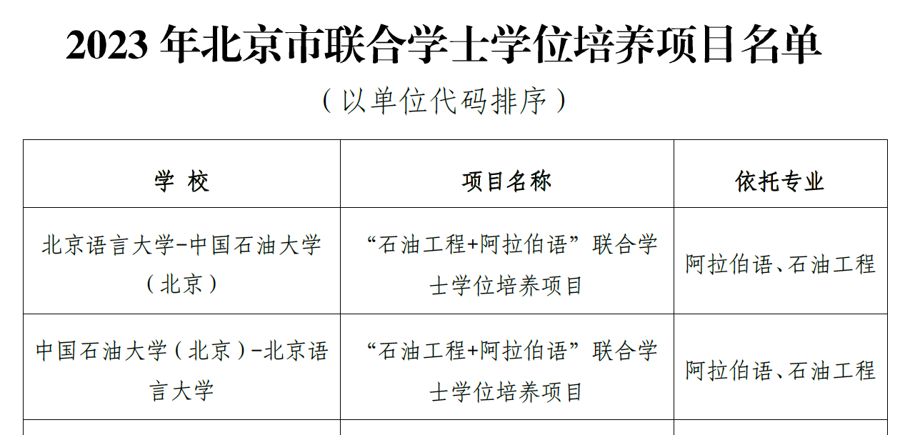 近日,北京市学位委员会发布了《北京市学位委员会关于公布2023年度双学士学位复合型人才培养项目及联合学士学位项目名单的通知》,我校与中国石油大学(北京)(以下简称“石油大学”)联合申请的“石油工程+阿拉伯语”联合学士学位培养项目成功获批。