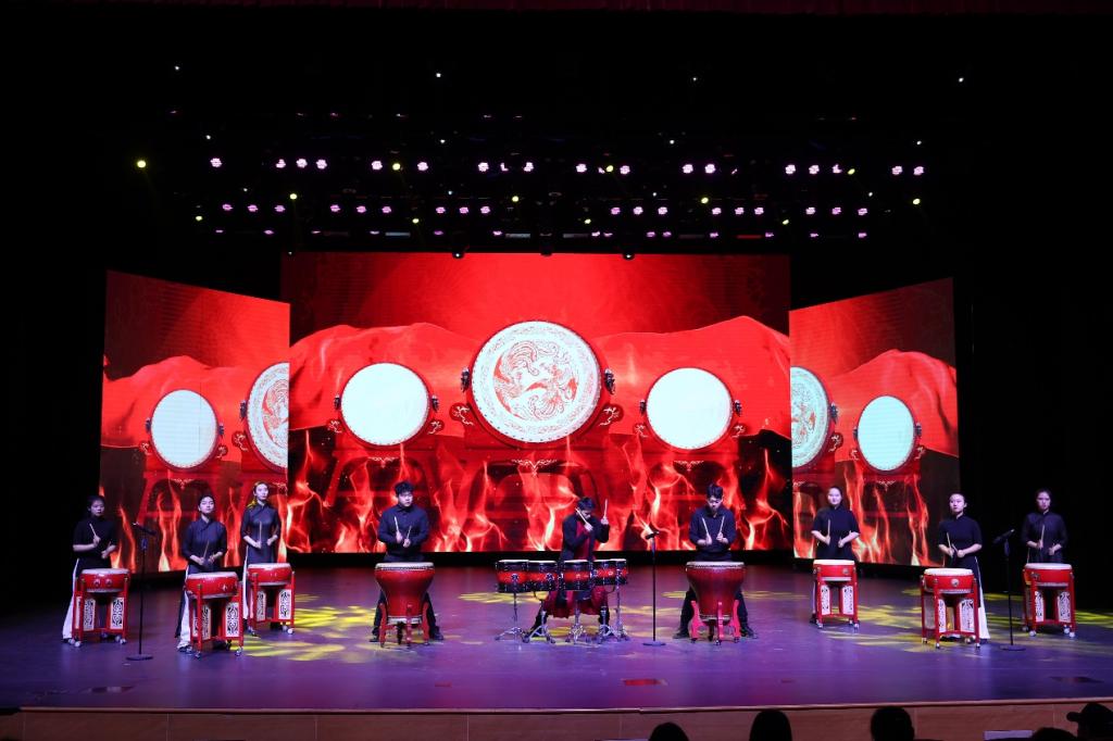 北京语言大学打击乐团带来打击乐合奏《龙腾虎跃》,带有强烈节奏感的鼓声将会场氛围点燃。