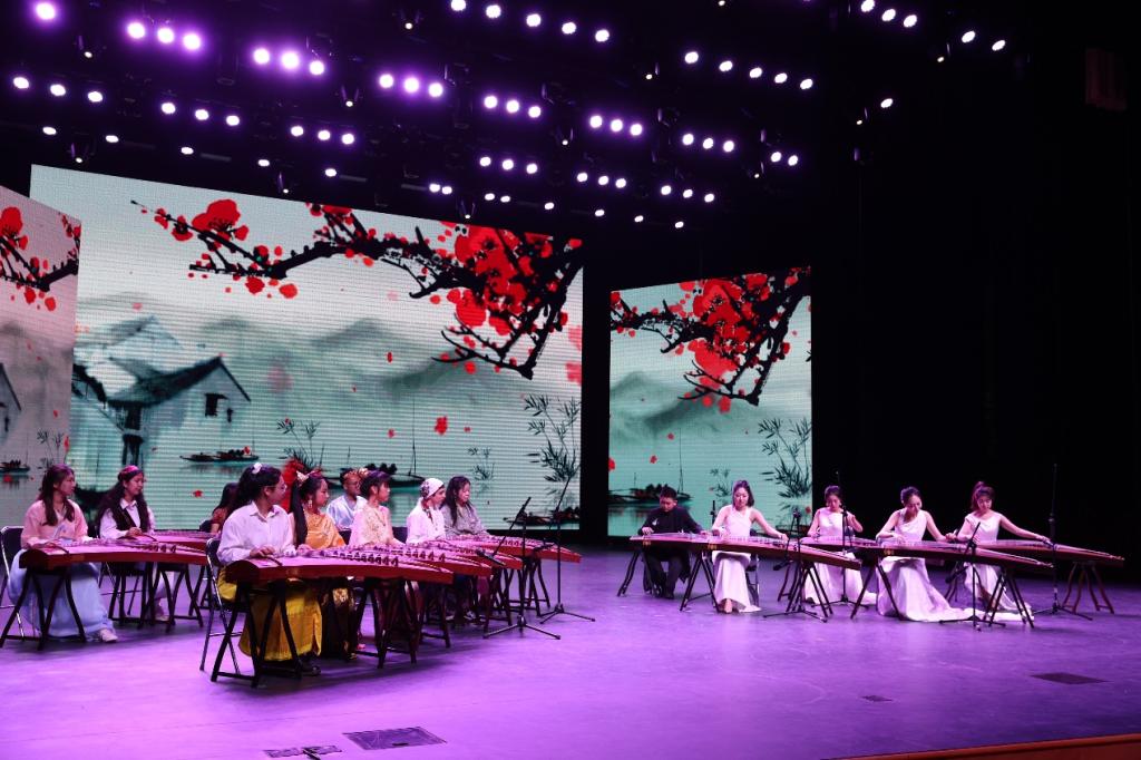 古筝联奏中,来自六个不同国家的国际学生合奏了《茉莉花》,来自我国的学生通过演奏呈现高山流水的美好景色。