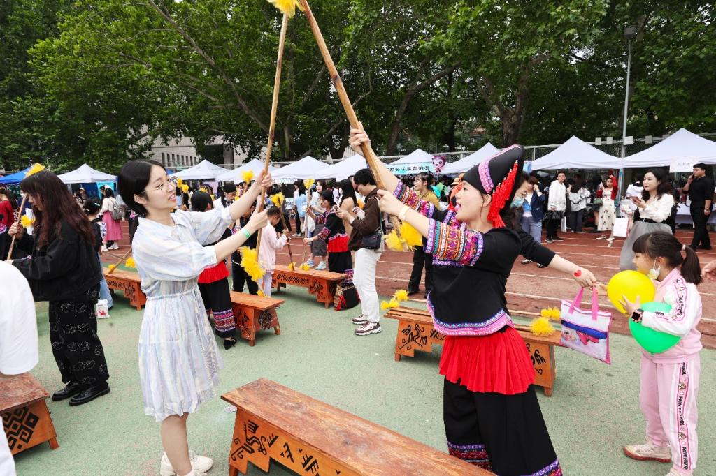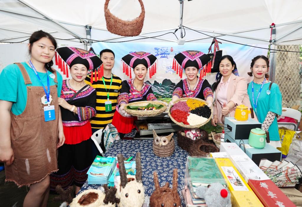 文化节特别设立了广西都安瑶族自治县展示区,全方位展示了都安瑶族特色民族服饰、都安农特产品、都安风物, “魅力瑶山 来者都安”的标语在整个活动现场格外醒目。都安的竹藤草芒编制工艺品、文创产品、民族服饰、打扁担互动等,吸引了中外游客纷纷驻足打卡体验。更有带着纯天然植物清香的五色糯米饭、麻叶馍令观众回味无穷、赞不绝口。