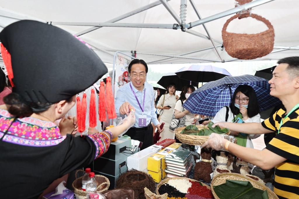 我校党委书记倪海东,校长刘利,副校长黄益方分别来到都安展区参观,体验都安风物及特色美食。