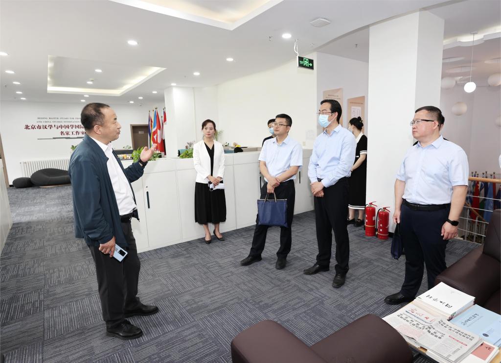 共青团中央宣传部一行,首先来到我校一带一路研究院开展调研。一带一路研究院院长徐宝锋、副院长黄悦向大家展示我校承担秘书处工作的亚洲经典著作互译计划的相关成果,介绍一带一路国际传播能力建设展、播放世界汉学中心宣传视频、共同观摩全球汉学家生态观测系统,全面介绍了研究院为“一带一路”倡议输送优质学术力量的突出贡献。