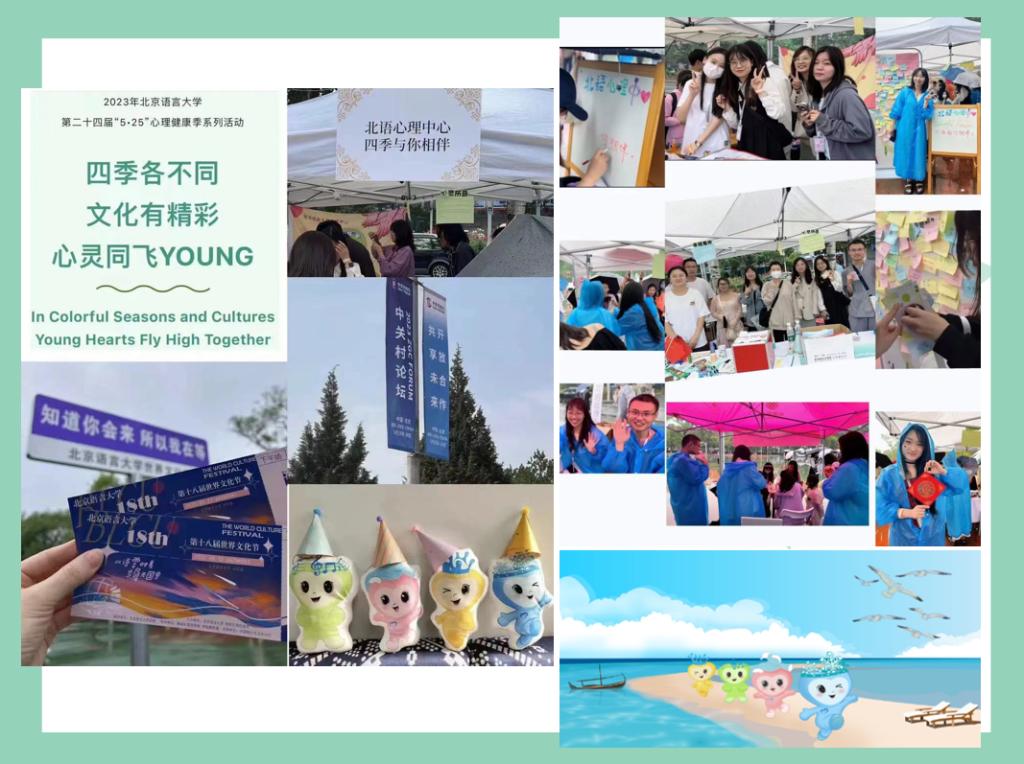 5月27日,北京语言大学第十八届世界文化节隆重举行,“北语零时差·步履无国界”,各国青年齐聚北语,全球文化美美与共。春夏之际,恰逢北京语言大学第二十四届“5·25”心理健康季,心理中心携“四季文化”主题活动与心理健康文化吉祥物“派大心”参加世界文化节。这是心理中心自2019年在世界文化节推出“多元文化·多彩心理”主题活动后,时隔三年再次与同学们在北语校园相会,也是我校心理健康文化吉祥物“派大心”的四季形象“小跃”、“小荷”、“小满”和“小朗”首次集体亮相。