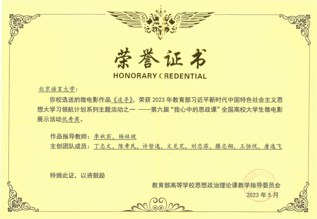 近日,教育部公布了“我心中的思政课”——第六届全国高校大学生微电影展示活动获奖名单,由我校党委宣传部和马克思主义学院报送,马克思主义学院教师杨林坡、李秋实老师指导,丁志文、陈章民、许哲逸、文见芃、刘恋菲、滕志翔、王恒悦、唐逸飞同学创作的微电影《追寻》在全国31个省市自治区744所高校报送的1684部微电影作品荣获优秀奖。
