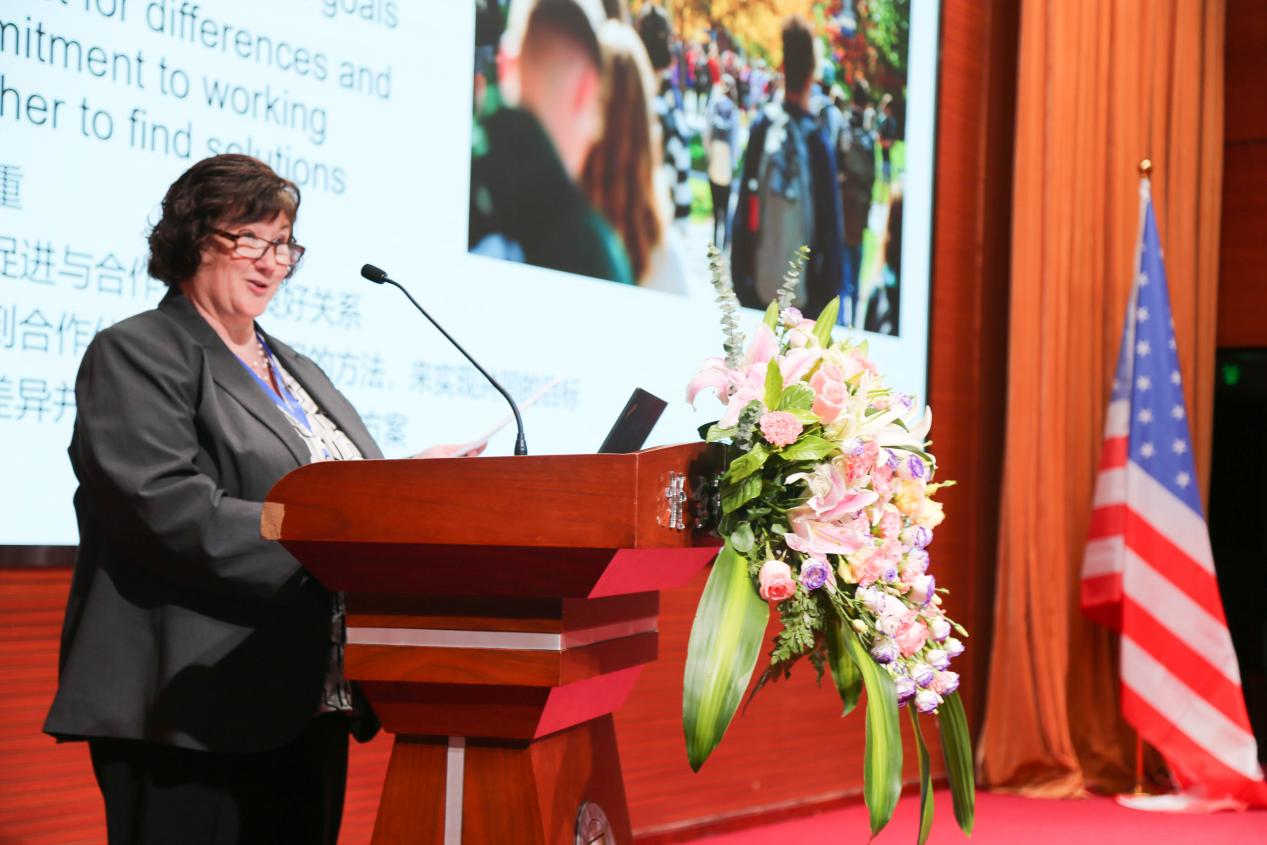 Mary Frances Hoffman围绕坚持、创新、共赢的大会主题,通过案例分享,阐述了中美教育交流可持续发展的关键要素,包括共同的利益与价值观、相互尊重、创意互惠、开放式沟通以及分享成果。