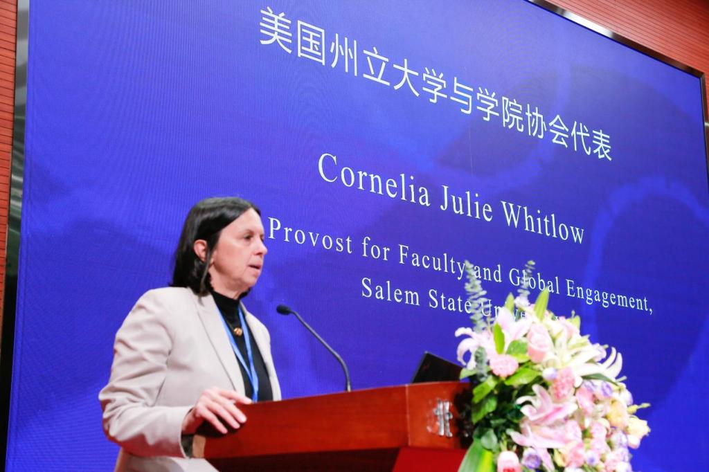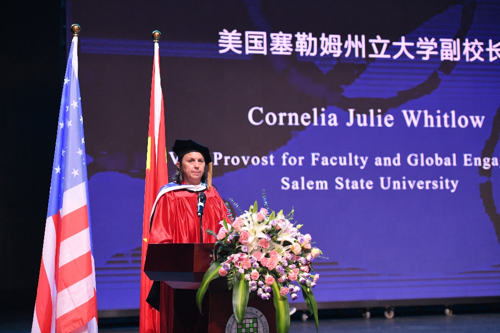 美方大学代表、塞勒姆州立大学 Cornelia Julie Whitlow副校长在发言中表示,毕业生们将在新的领域施展自己的才华,希望未来他们能够力荐以后的学生就读他们在中国和美国的母校,并保持与母校的联系,希望他们能够成为终身学习者,并在为自己规划美好未来的同时用自己的知识帮助更多的人。