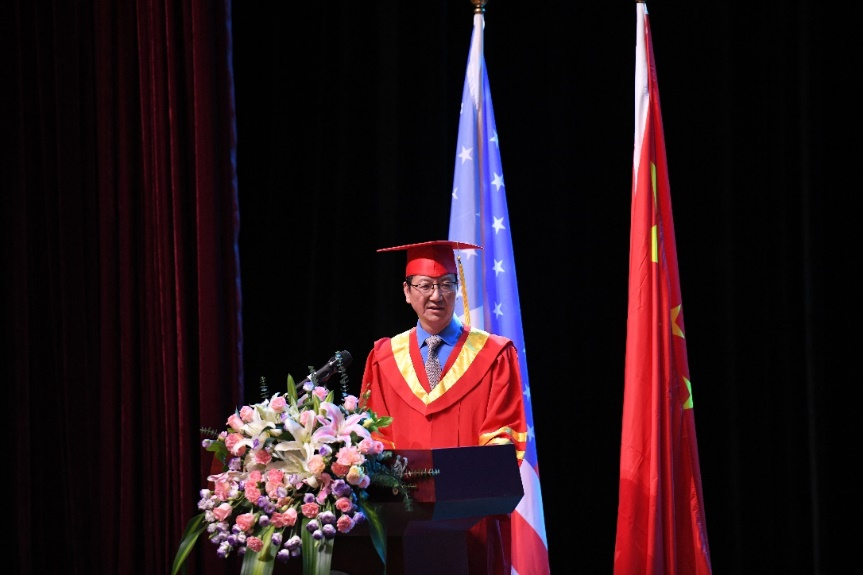常熟理工学院姜建明校长代表中方大学致辞,他寄语毕业生要保持热爱,让学习成为终身习惯,要学会适应,做创造价值的社会人,要保持开放,做有担当的中美使者,要心怀感恩,做有情怀的国际青年。