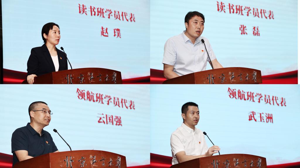 主题教育读书班学员代表赵璞、张磊,领航班学员代表云国强、武玉洲依次上台汇报了培训成果和心得体会。赵璞同志依托主题教育根本任务“学思用贯通,知信行统一”汇报了三个方面的学习收获。张磊同志围绕强化思想、政治、行动自觉三个“矢志不渝”分享了自己的心得体会。云国强同志植根“百年未有之大变局加速演进”的时代背景提出了学校、学院事业发展的“三个当务之急”。武玉洲同志结合自身工作从“明德惟志、敬教劝学”、“日省日新,上下求索”、“功成有我,勇担使命”三个方面聚焦高校立德树人根本任务分享了自己的认识和体会。学员代表们的发言生动展现了读书班、领航班在“以学铸魂、以学增智、以学正风、以学促干”方面所取得的实效。