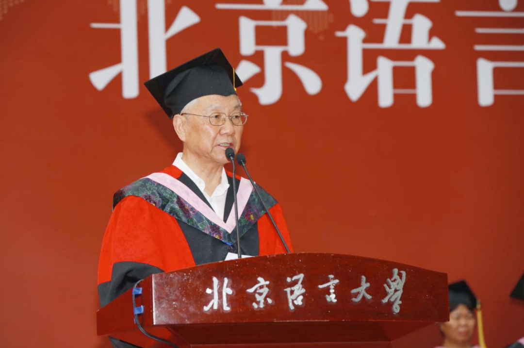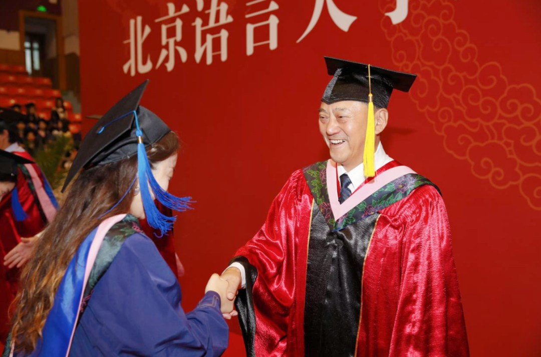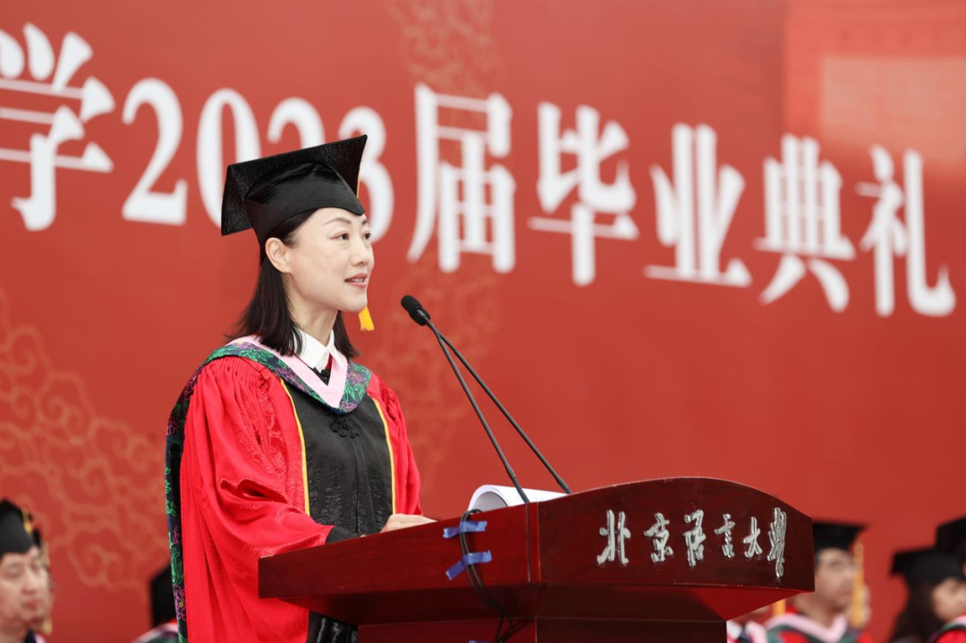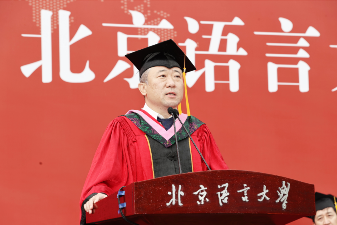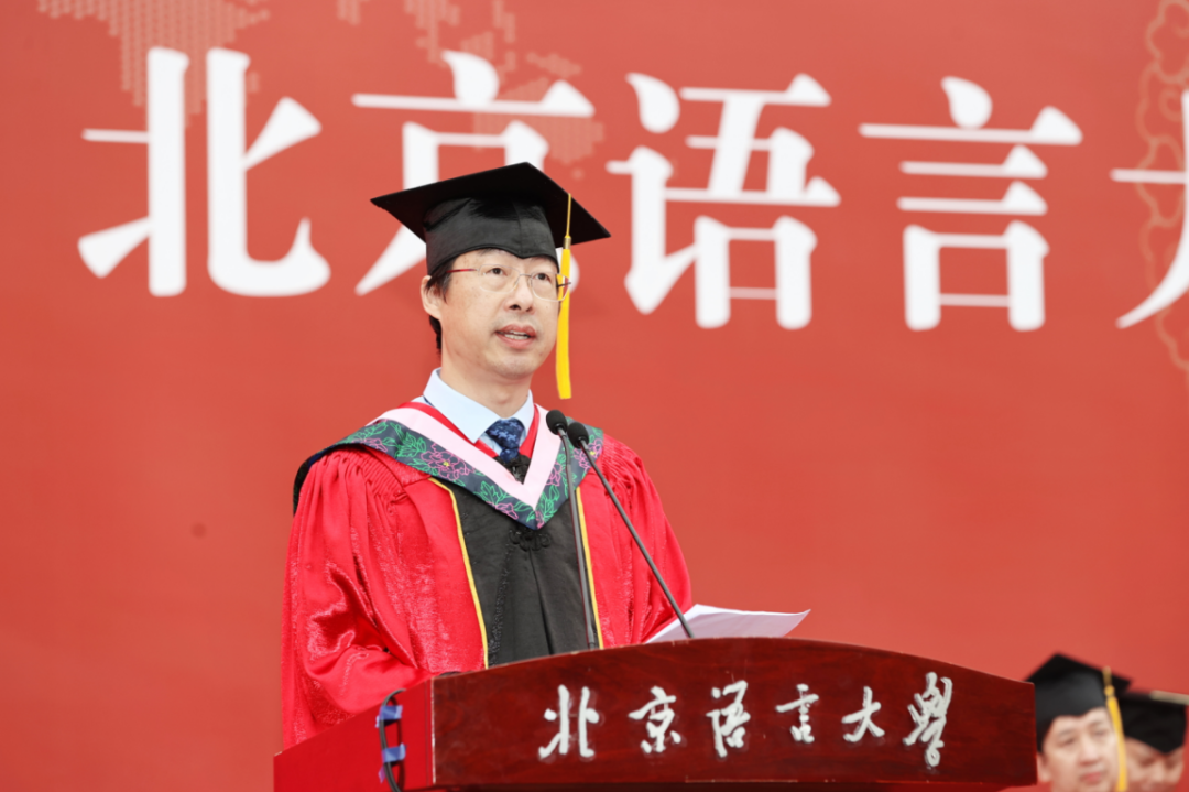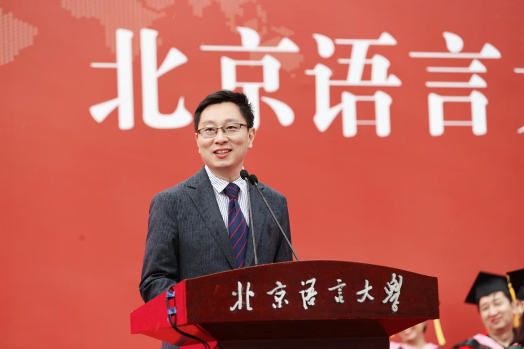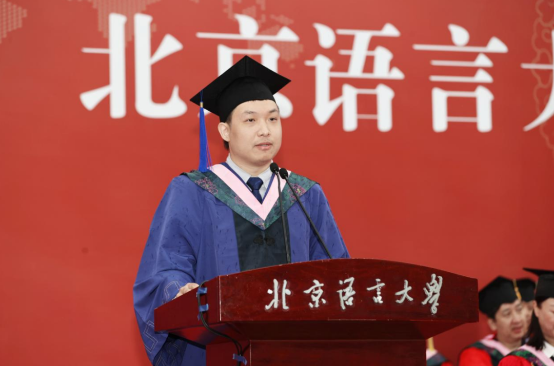 “前程无忧”副总裁赵坤作为校友代表发言。他用自己的人生经历和切身体验,为同学们送上学长的毕业寄语。一是以开放的心态,拥抱时代最新的变化。用最开放的心态,主动去了解从科技到经济、到社会、到国际关系的最新变化,从中寻找人生和职业的机会;二是以系统思维方式,快速丰富自己的人生经历。大学教育除了教授我们丰富的专业知识之外,更重要的是培养了一套系统性、框架性的思维方式。大家要积极勇敢地多去经历各种社会的纷繁复杂,有意识地练习使用系统、框架的逻辑思维面对一切工作生活中的问题;三是以真挚的热爱,把母校作为自己永远的心灵港湾。无论走到哪里,无论走得多远,北语都是港湾,都是人生的锚点。