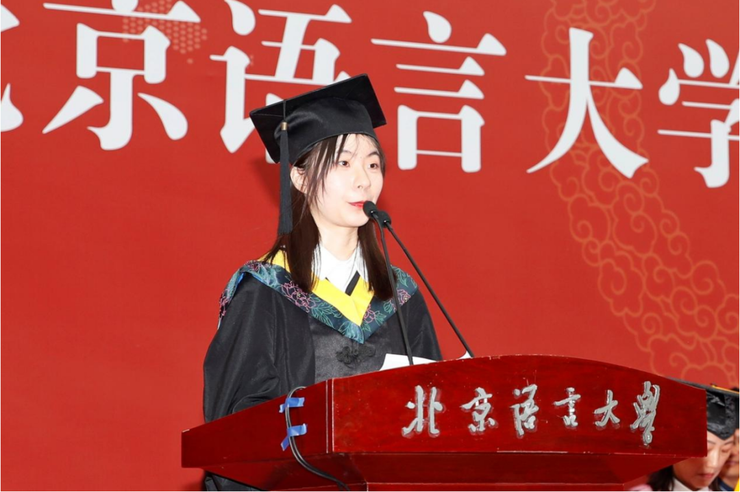 信息科学学院2019级信息管理与信息系统专业的王凤仪代表本科生发言。她表示,北语多元、包容的校园氛围给予了每一位学子发现自我与探索世界的机会,北语丰富多彩的学术讲座、社团活动与社会实践使每一位学子得以更全面地拓展自己的知识面和视野,北语倡导的人文精神与国际视野成为了每一位的思维底色与行动指南。她说,梧桐大道与来园的经历与体验会一直在回忆中闪烁着光芒,成为继续前行的力量。