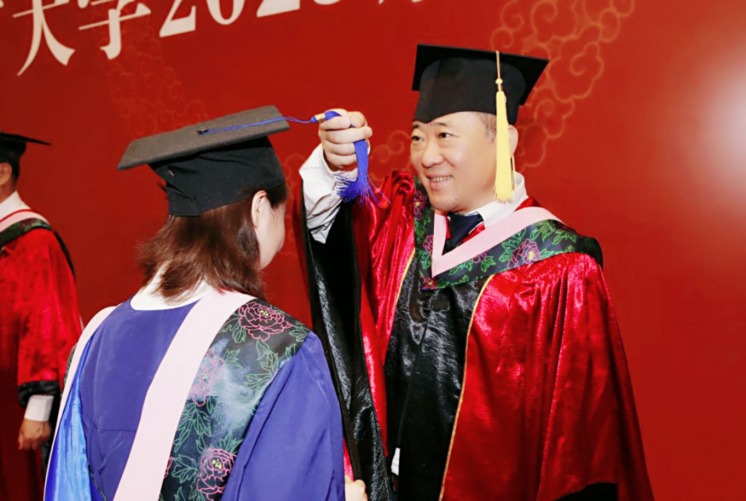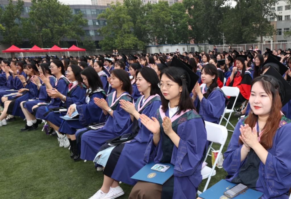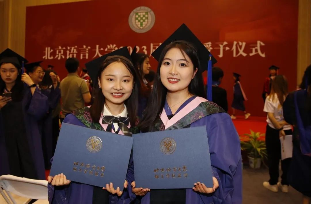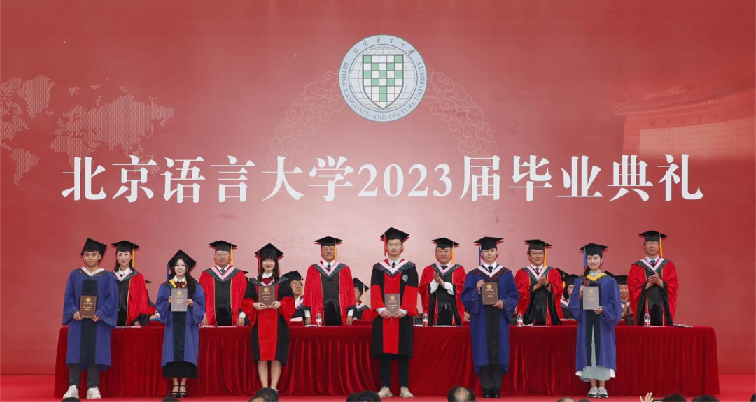 随后,学位授予仪式在逸夫体育馆举行,校领导为2023届毕业生拨穗、授予学位,并合影留念。毕业典礼通过微信视频号、新浪微博、抖音、快手等平台全程直播,世界各地北语学子及其亲友等近3万人次通过云端观看毕业典礼,毕业生家长也纷纷用真挚话语表达对学校和老师的感谢和祝福。