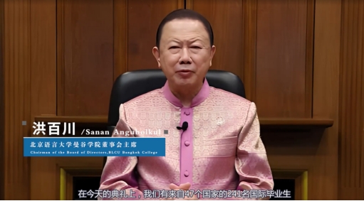 北京语言大学曼谷学院董事会主席、泰国商会主席洪百川在致辞中说,毕业生中有27人是泰国同学,能从北语获得学位是一种荣誉。北语致力于培养具有全球意识的良好公民,因此,毕业生们有责任拓展自己的成功愿景,促进社区、国家乃至整个世界的发展,为世界变得更美好做出自己的贡献。