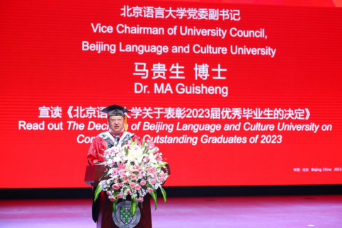6月30日下午,面向全球直播的北京语言大学2023 届国际学生毕业典礼暨学位授予仪式在梧桐会堂隆重举行。段鹏校长发表讲话并为优秀毕业生颁发奖牌,学校党委马贵生副书记宣读了《北京语言大学关于表彰2023届优秀毕业生的决定》,张宝钧副校长主持,党委委员、统战部部长吕静为毕业生送上赠礼;教师和毕业生代表发表了情真意切的讲话;厄瓜多尔共和国前副总统阿古阿尤·库比里奥,泰王国前副总理、校友王篷贴,土耳其共和国驻华大使伊斯梅尔·哈克·穆萨,日本国驻华大使馆新闻文化中心公使贵岛善子,泰王国驻华大使馆公使衔参赞钟鑫,老挝人民民主共和国驻华大使馆教育文化参赞靳达望等嘉宾代表致辞,美国中文教师协会会长、华盛顿大学教授梁霞、墨西哥学院亚非研究中心教授莉莉亚娜·阿索夫斯卡等海外嘉宾在线上为毕业生们送上诚挚祝福和殷切希望。土耳其驻华大使馆教育文化参赞蒋苏,曼谷学院外方院长李志雄等外国嘉宾、学校职能部门、教学科研单位、直属单位和海外分校的相关领导出席典礼;来自泰国、马来西亚、韩国、日本等47个国家和地区的240名毕业生及其亲友,北京语言大学曼谷学院、东京学院的师生代表共同见证了这个重要的时刻。