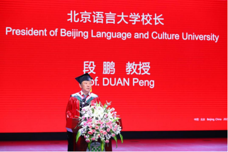 段校长首先代表学校,向即将毕业的同学表示热烈的祝贺,向始终关心支持学生们的家人们表示由衷的感谢!他在讲话中说,北京语言大学培养了来自世界上184个国家的22万名学子,从新中国建国初期民间外交的主力军,到改革开放最前沿的新生代,再到文明互鉴潮流中的担当者。他们已经成为中国与世界交流的重要纽带和桥梁,其中既有哈萨克斯坦总统卡塞姆•托卡耶夫,埃塞俄比亚总统前穆拉图•特肖梅•沃图,俄罗斯外交部副部长伊戈尔•莫尔古洛夫这样的政要,也不乏美国物理学家、诺贝尔奖获得者埃里克•康奈尔等著名科学家。北语还被称为“汉学家的摇篮”,德国的著名学者顾彬、法国的著名学者朱利安,喀麦隆中教部汉语总督学杜迪等都曾在此开启汉学之旅。