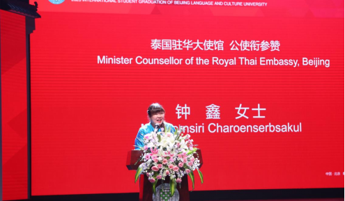 钟鑫公使衔参赞在致辞中说,在月初访问北京语言大学时,就发现这里的氛围很好,适合学习、宜居、很国际化。这次毕业的40名泰国学生和其他毕业生们能在北语学习是非常幸运的,而同学们克服疫情造成的困难,完成学业也证明了自己的潜能。希望大家用自己的所学为工作单位和国家做出积极贡献。