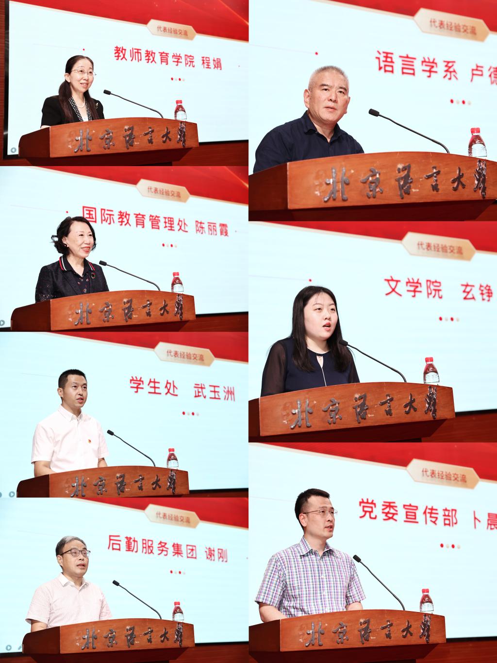 教师教育学院党委书记程娟、国际教育管理处处长陈丽霞、学生处处长武玉洲、后勤服务集团党总支书记谢刚、语言学系卢德平教授、文学院辅导员玄铮、宣传部副部长卜晨光分别作了交流发言。