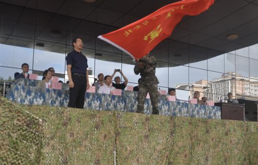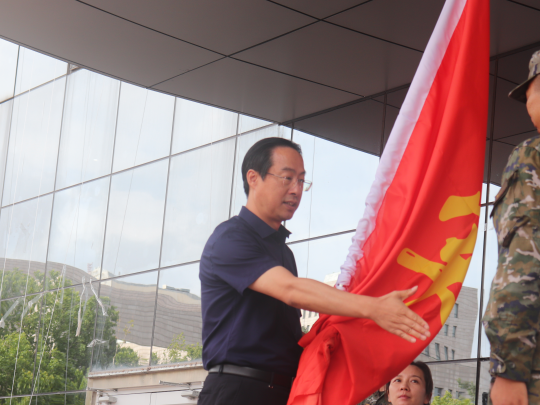 校党委常委、副校长黄益方为军训团授旗。军训团旗猎猎飘扬,北语军训团以旗明志,志气昂扬。