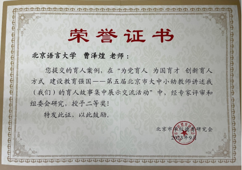 在第39个教师节前夕,9月9日,由北京市委教育工委、市教委主办,市学校德育研究会承办的第五届北京市大中小幼教师讲述我(我们)的育人故事展示交流活动隆重举办。我校国际中文学院院长沈庶英教授和外国语学部曹泽煌副教授的育人故事分别获评“第五届北京市大中小幼教师讲述我(我们)的育人故事展示交流成果”一、二等奖。