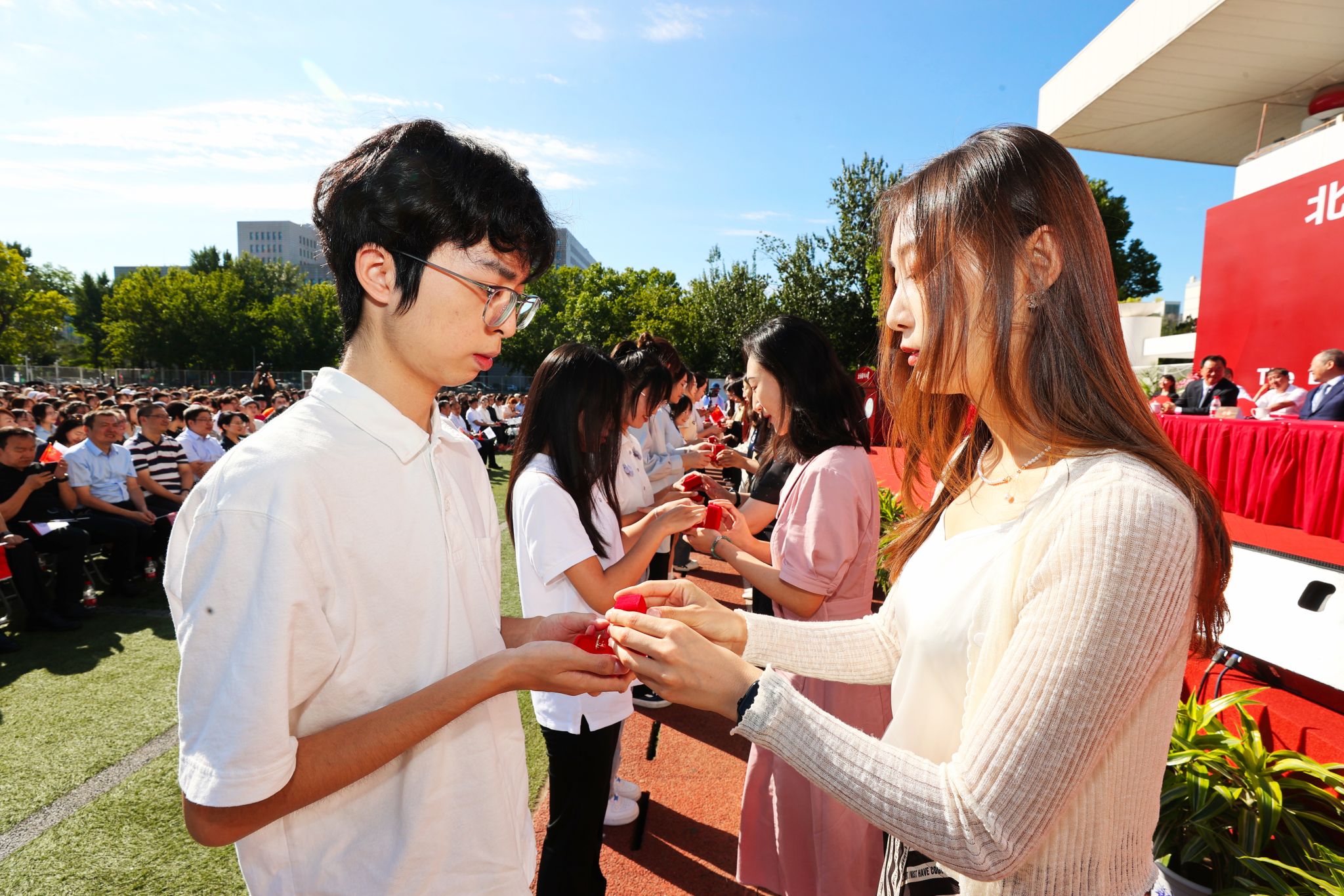 开学典礼还特别设置了辅导员为新生赠校徽仪式,来自各学部(院、系)的新生辅导员亲手将校徽交给学生,从戴上北京语言大学校徽的那一刻起,标志着新同学成为一名真正的北语人,辅导员将作为他们的陪伴者、引路人,见证他们成长,点亮他们前行的道路。