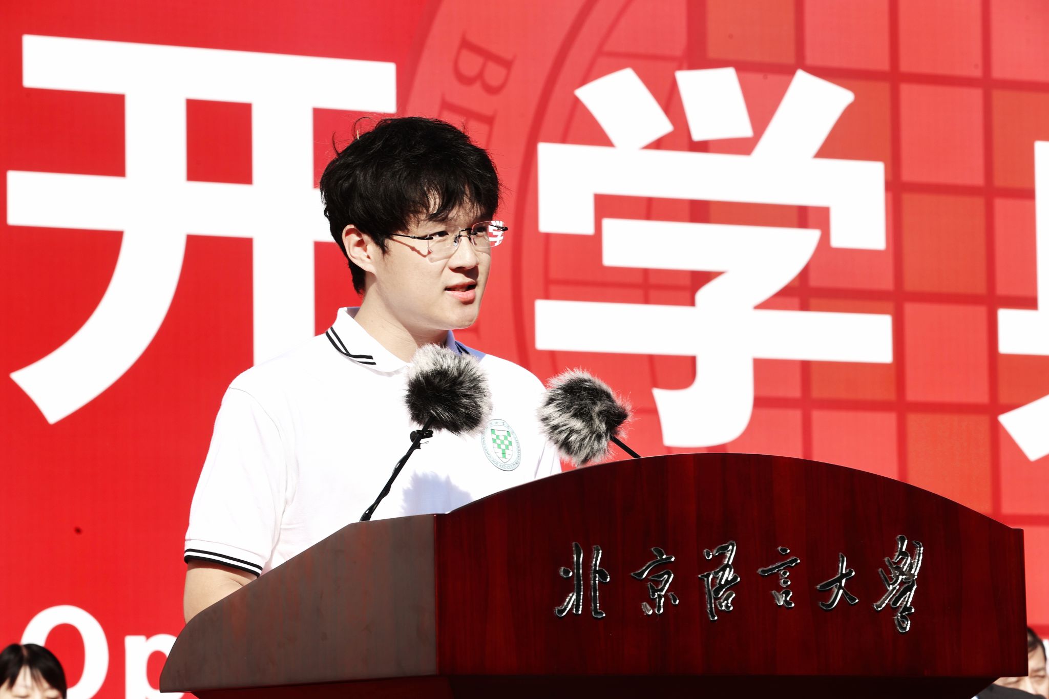 上午8时30分,开学典礼正式开始。在庄严的升国旗、奏唱国歌仪式之后,外国语学部西方语言文化学院2023级西班牙语专业孙英博同学代表全体本科新生发言。作为北京市第一封普招录取通知书的获得者,他以《致知而学,行在征程》为主题分享了对于在当前时代背景下如何自律自强、认真学习知识、提升品德修为、成为国之栋梁的思考心得,希望通过在北语的学习为深化文明交流互鉴,构建人类命运共同体贡献自己的智慧和力量。