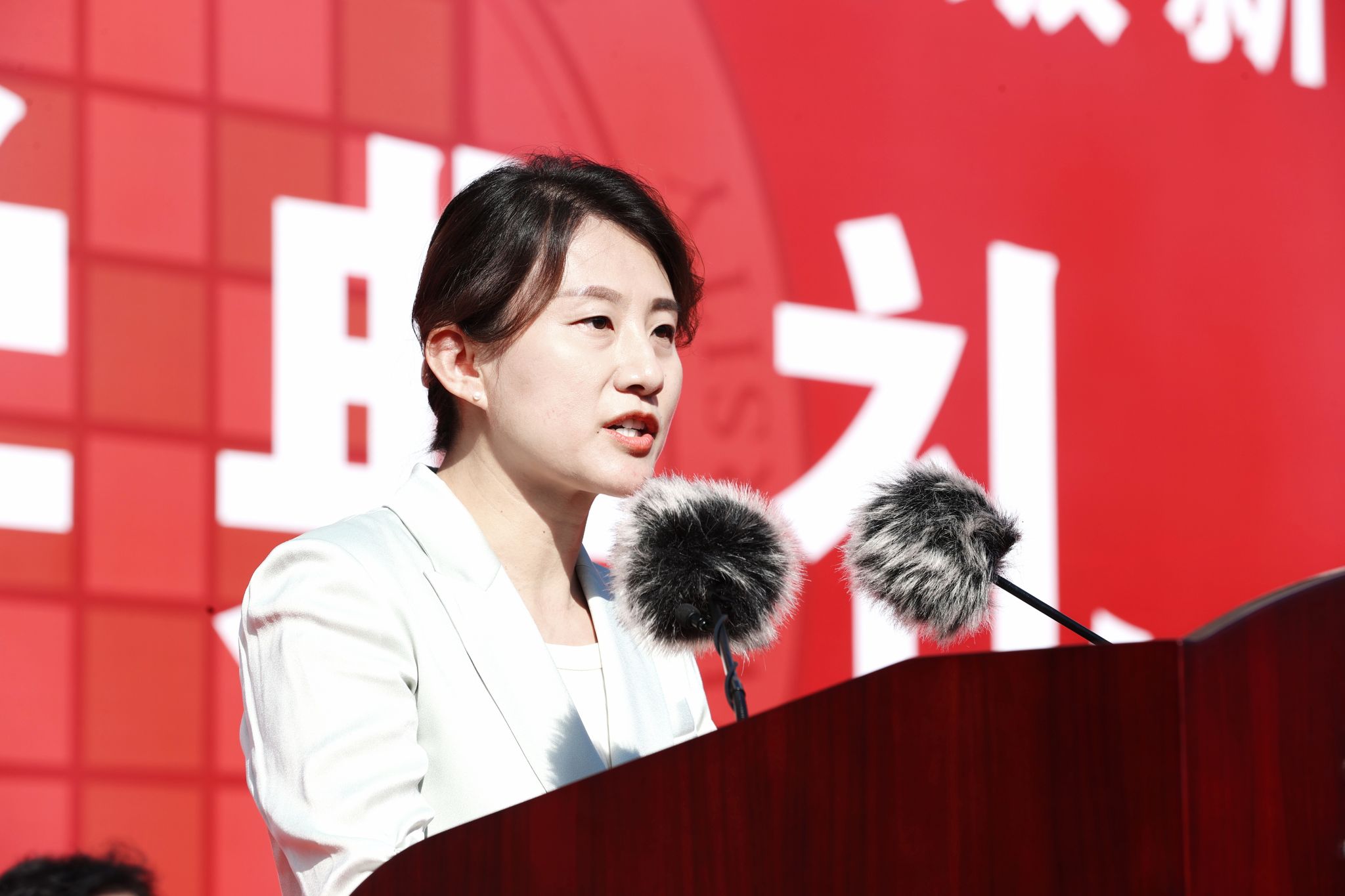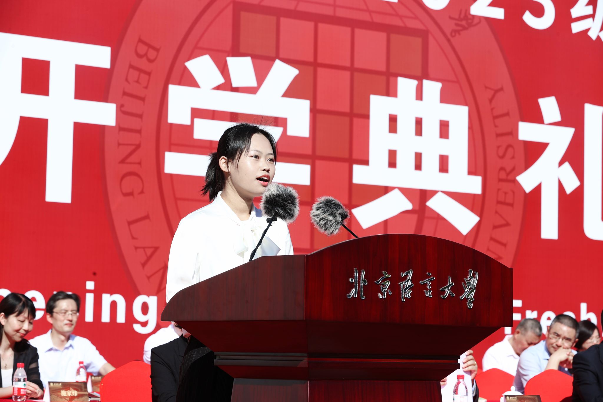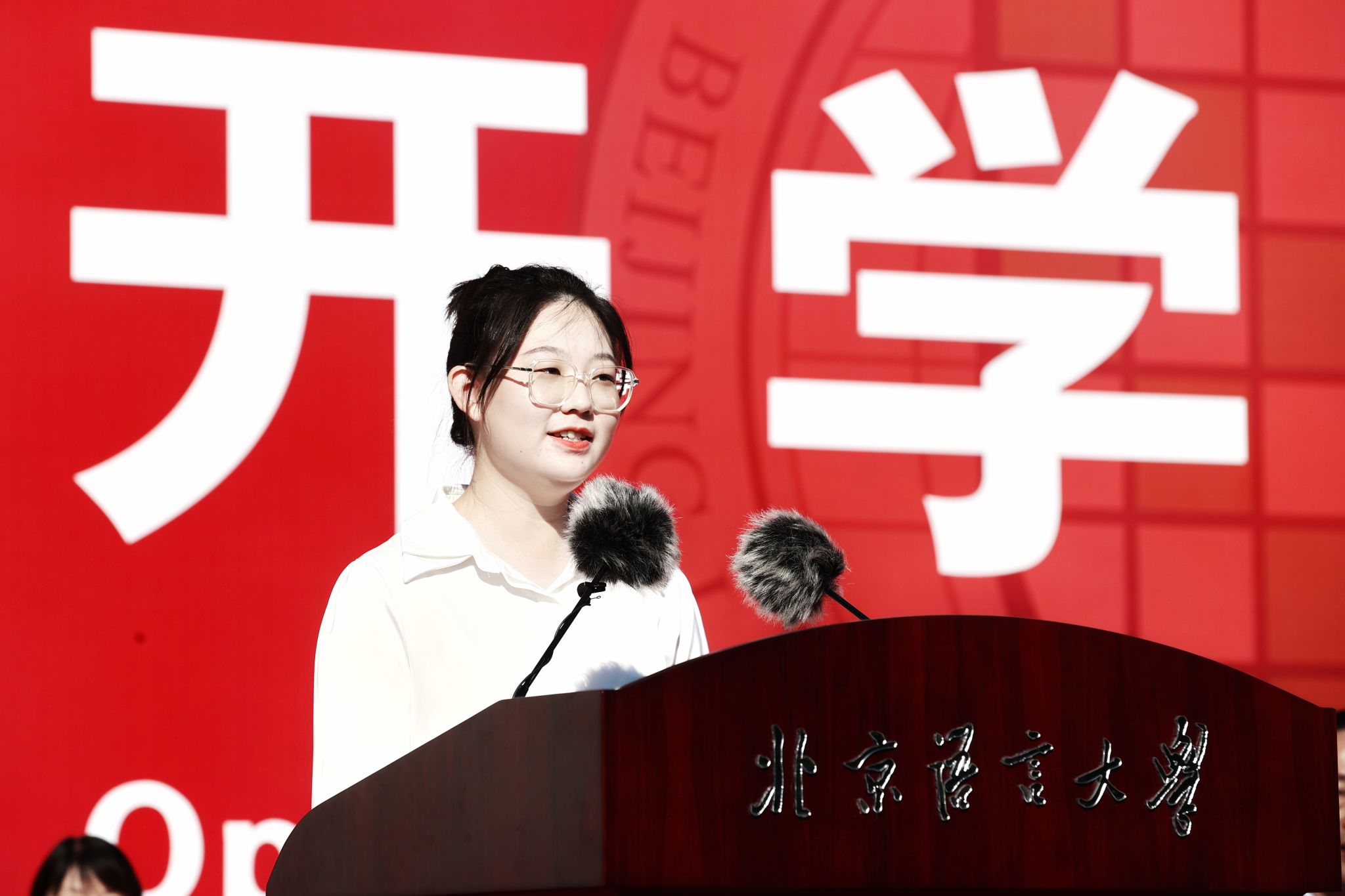 来自教师教育学院2021级汉语国际教育专业的马洁新作为在校生代表欢迎2023级新生,并希望从今天开始,与各位新生一道耕耘一片新的土地,打开一扇新的大门,搭建一座新的桥梁,在北语这片饱含激情的土地上,延续过往的憧憬,带着未来的希冀,怀抱干劲和勇气,开启充满光明和梦想的远征。
