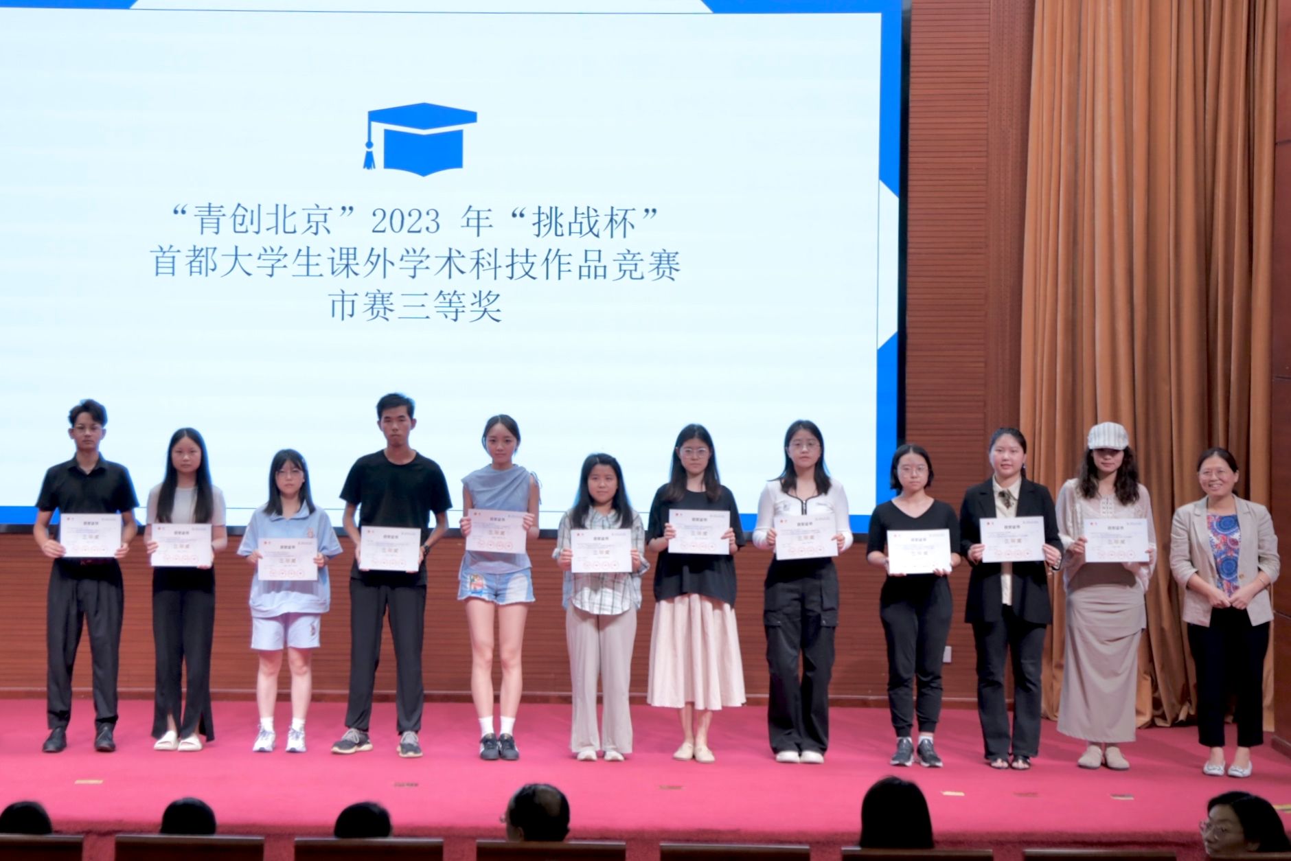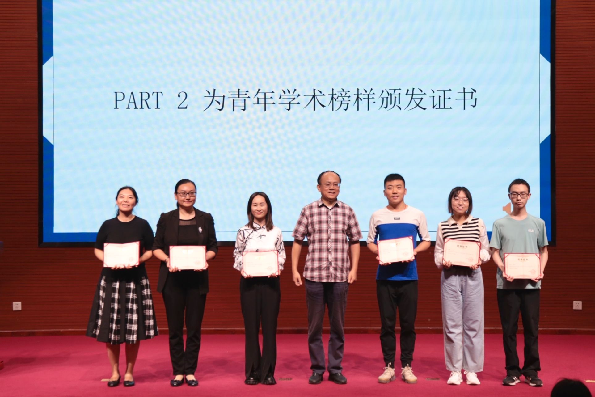 随后进入颁奖环节,由郭鹏老师、闫冬老师、刘宝霞老师为青年学术榜样及2023年“挑战杯”全国大学生课外学术科技作品竞赛市赛获奖团队颁奖并合影留念。