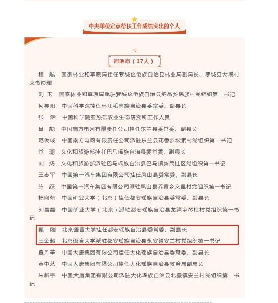 自定点帮扶及乡村振兴工作开展以来,学校严格落实上级要求,认真做好脱贫攻坚与乡村振兴各项工作,先后派驻4名干部赴广西都安瑶族自治县挂职,坚持精准帮扶方略,实现了全面推进乡村振兴的良好开局。本次上级对甄刚同志和王金超同志的表彰,体现了对我校定点帮扶干部的高度肯定,也彰显了对我校在巩固拓展脱贫攻坚成果同乡村振兴有效衔接工作的高度认可。