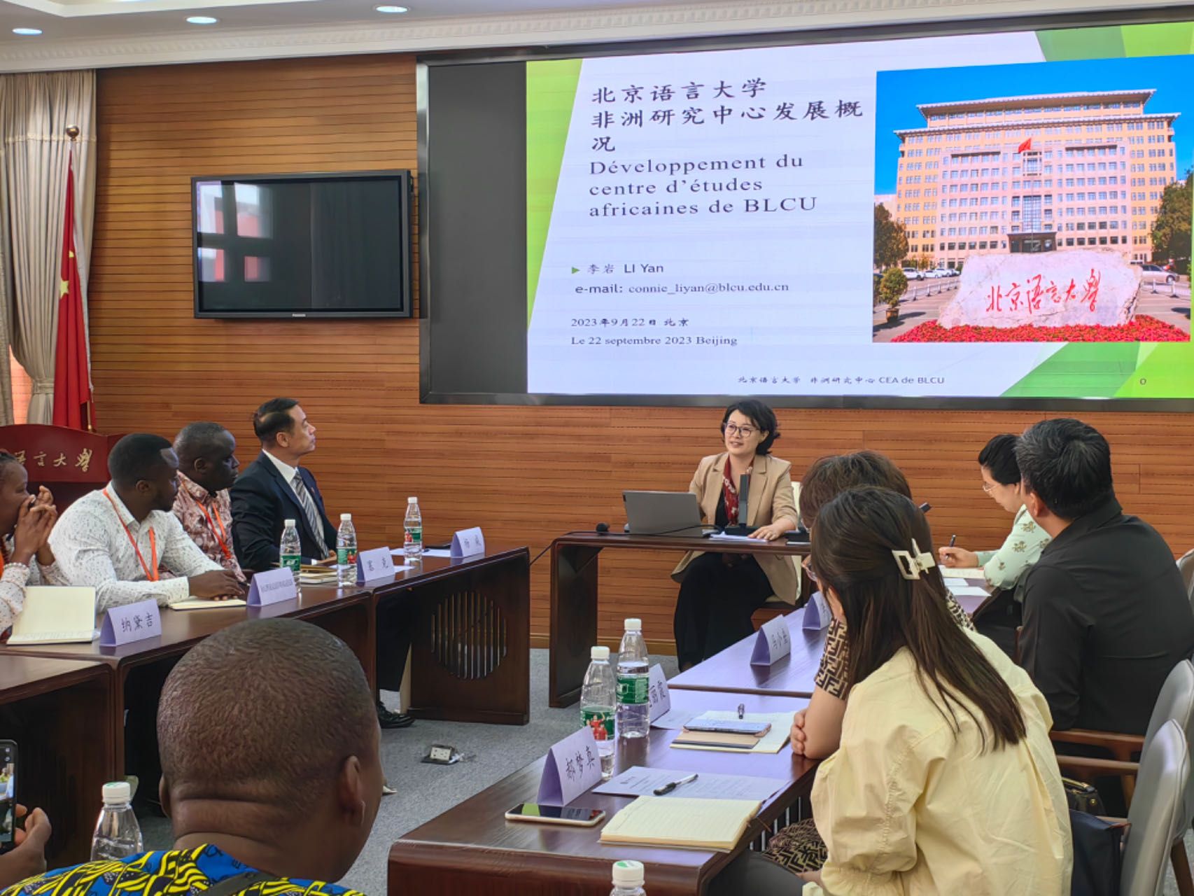 下午15点,非洲研究中心安排来访非洲法语国家官员代表团与校内职能部门和留学生代表在逸夫楼第一会议室见面座谈。非洲研究中心主任李岩首先欢迎来访的北京国际汉语研修学院杨威院长一行并概述了北语非洲研究中心的发展状况,杨威院长对教育部备案中心——北语非洲研究中心精心设计的参访活动表示感谢,并希望两校今后有更多更广泛的合作,为我国国际中文人才培养尤其知华友华外国学员的培养贡献力量。