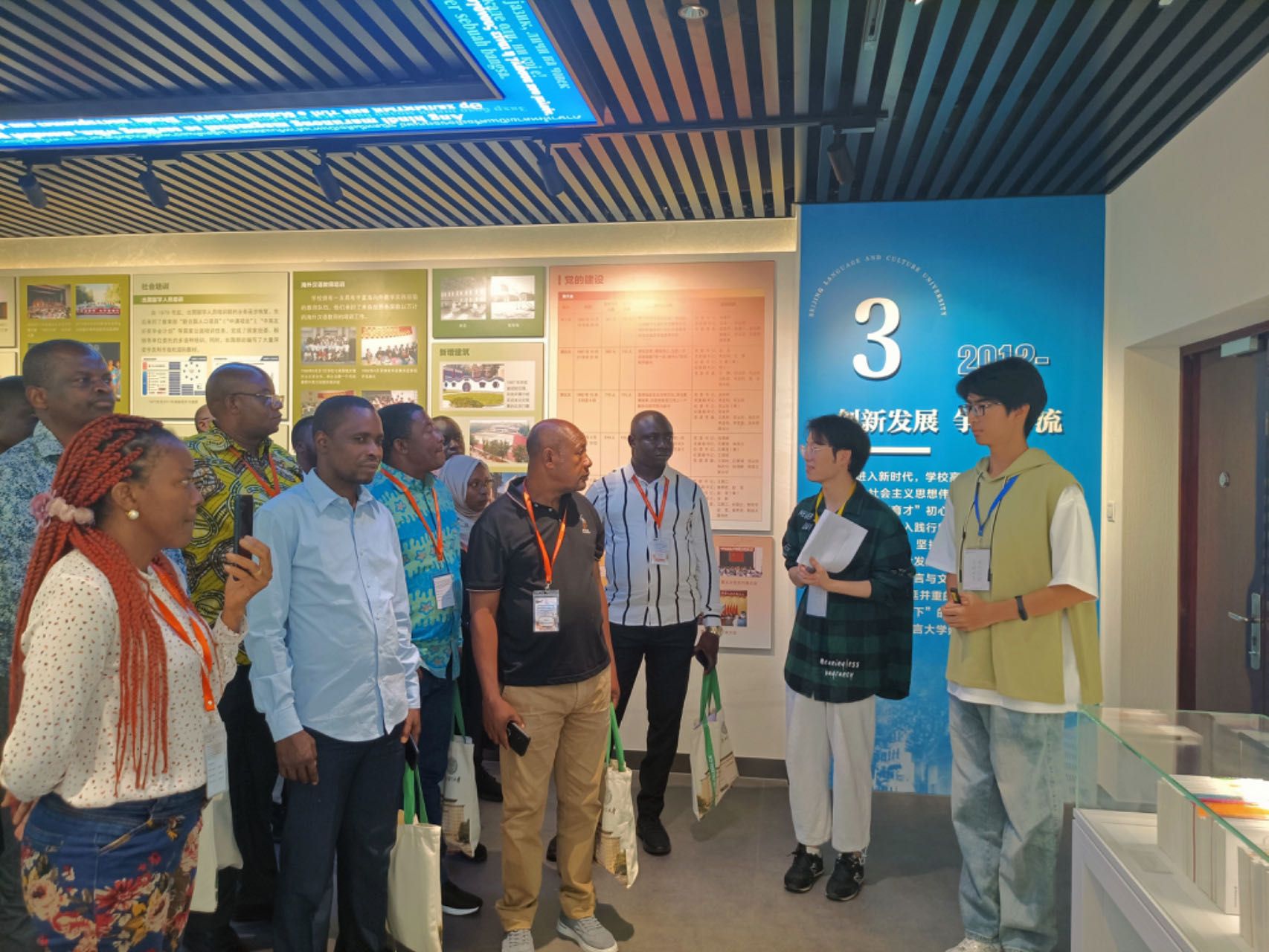 非洲研究中心王兰老师担任座谈会主翻译,研究生郑雨辰协助完成翻译,胡霄钦老师参与校史馆参观陪同活动,23级硕士研究生参与了本次参访活动的筹备工作。