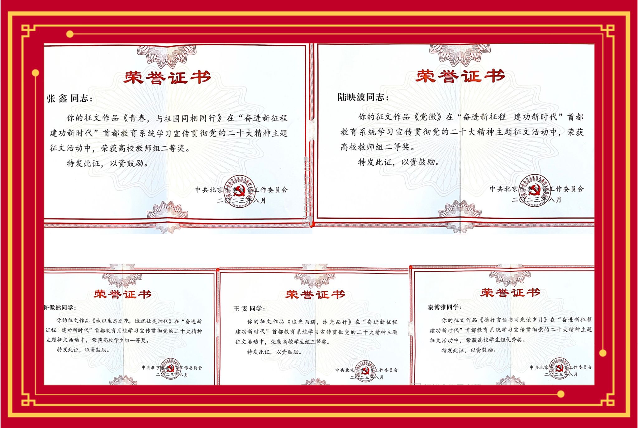 近日,“奋进新征程 建功新时代”首都教育系统学习宣传贯彻党的二十大精神主题征文活动落下帷幕。我校5位师生获奖,党委学生工作部教师张鑫、外国语学部中东学院教师陆映波荣获高校教师组二等奖,教师教育学院2021级汉语国际教育专业许傲然同学荣获高校学生组一等奖,信息科学学院2022级计算机科学与技术专业王雯同学荣获高校学生组三等奖,国际中文学院2022级汉语国际教育专业秦博雅同学荣获高校学生组优秀奖。