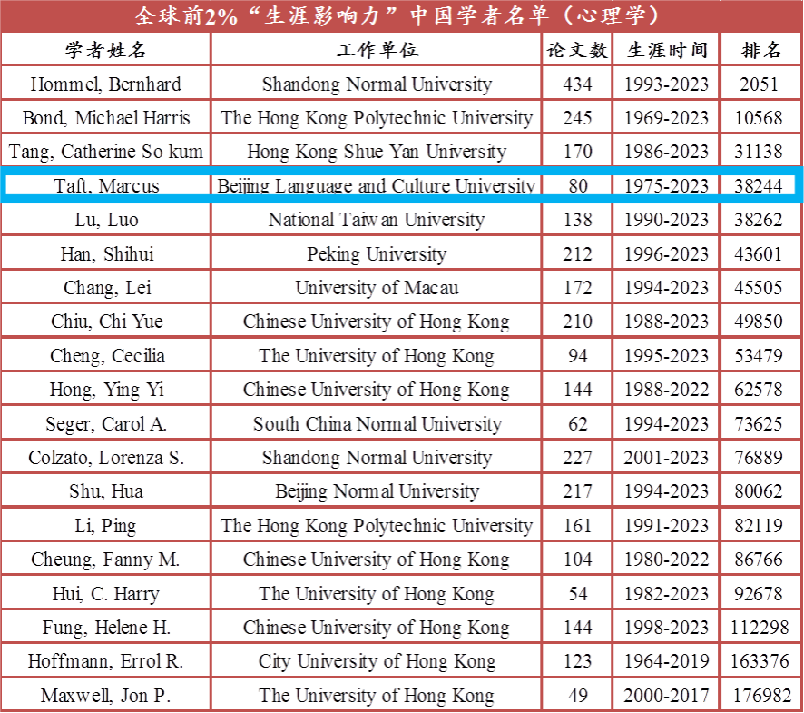 北京语言大学语言认知科学学科创新引智基地特聘教授Marcus Taft(马库斯-塔夫托)荣登全球前2%“生涯影响力”榜单和全球前2%“年度影响力”榜单。