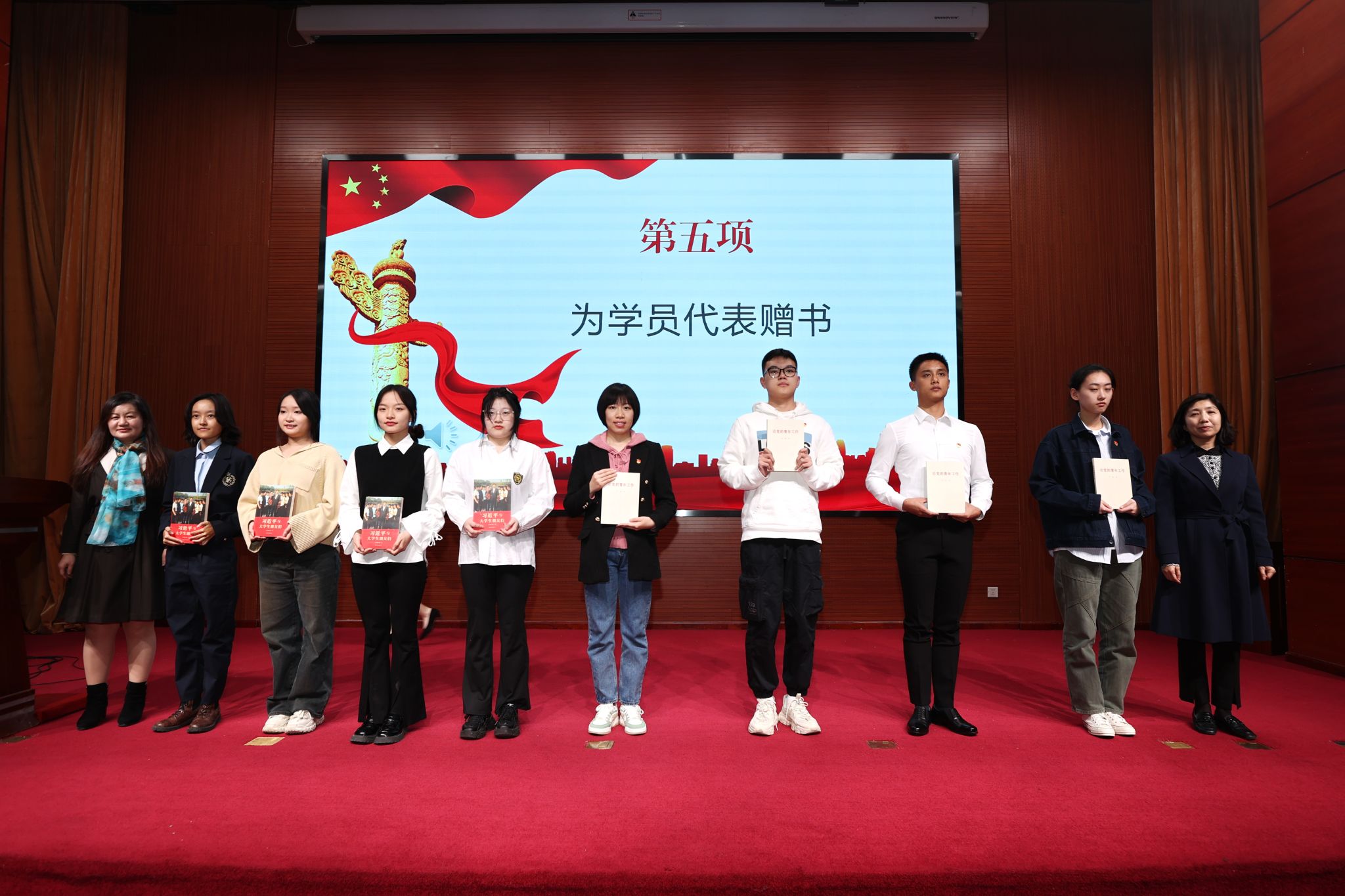 党委组织部部长张健老师、党委宣传部常务副部长黄展老师为学员代表们赠送《习近平与大学生朋友们》和《论党的青年工作》两本书,希望同学们认真学习著作,提升理论素养、增强党性修养。