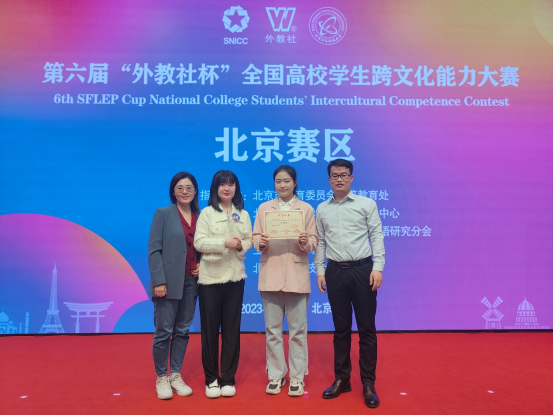 10月28日至29日,第六届“外教社杯”全国高校学生跨文化能力大赛北京赛区复赛、决赛圆满落幕。我校2020级英语专业何润彤、2021级汉语国际教育专业钟丽萍和2022级西班牙语专业帖木儿组成的代表队,在参赛的北京大学、对外经济贸易大学、中国传媒大学、外交学院等32所院校中脱颖而出,荣获北京赛区特等奖(第一名)。外国语学部依涵老师和高秀平老师荣获优秀指导教师奖,北京语言大学荣获优秀组织奖。这是北京语言大学第三次获得冠军,并代表北京市参加全国跨文化大赛。
