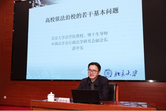 北京大学法学院教授、博士生导师、北京大学教育法研究中心主任、教育部—北京大学共建教育立法研究基地主任湛中乐教授围绕《依法治校的若干法律问题》作报告。湛教授对依法治国到法治中国的演变、法治中国背景下的依法治教与依法治校、高校依法治校的重要主体与重要目标进行了详细阐述,还结合部分教育行政诉讼典型案例,分析了教育行政诉讼的特点以及学校参与教育行政诉讼应当特别注意的若干问题。当前,高等教育已进入更加注重内涵发展的新阶段,随着教育改革的不断深入,学校办学自主权进一步落实,内部治理的法治化、制度化、规范化要求更为凸显,湛中乐教授的讲授精彩生动、鞭辟入里,为我们进一步深刻认识新形势新变化提出的新任务新要求,不断深化对依法治校重要性的认识,准确把握依法治校的科学内涵,以法治思维和法治方式推动保障学校的改革发展,积极探索提升高校法治工作水平和能力提供了有效对策和路径。