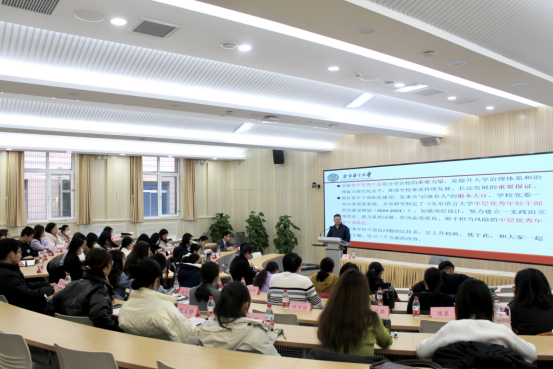 他指出,党和国家高度重视年轻干部队伍建设,学校青年管理干部是办学治校的重要力量,是提升大学治理体系和治理能力现代化水平,推进学校事业持续发展、长远发展的重要保证,抓好青年干部队伍建设,是事关“后继有人”的根本大计,青年干部的优势远远大于不足,青年干部有好的基础,但必须牢记“廉洁奉公”。