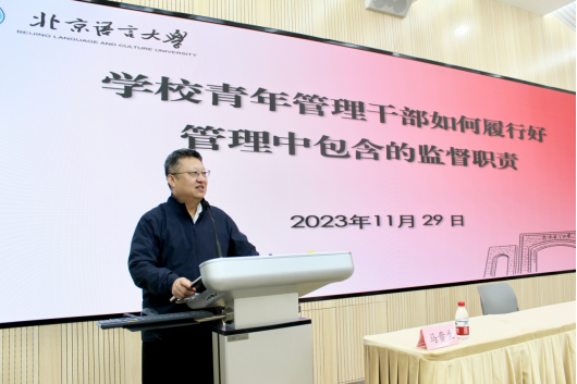 11月29日上午,北京语言大学第一期青年管理干部能力提升培训班在教二楼101开展专题培训。党委教师工作部、校机关党委邀请到学校党委副书记、纪委书记马贵生为大家作“学校青年管理干部如何履行好管理中包含的监督职责”的专题讲座。