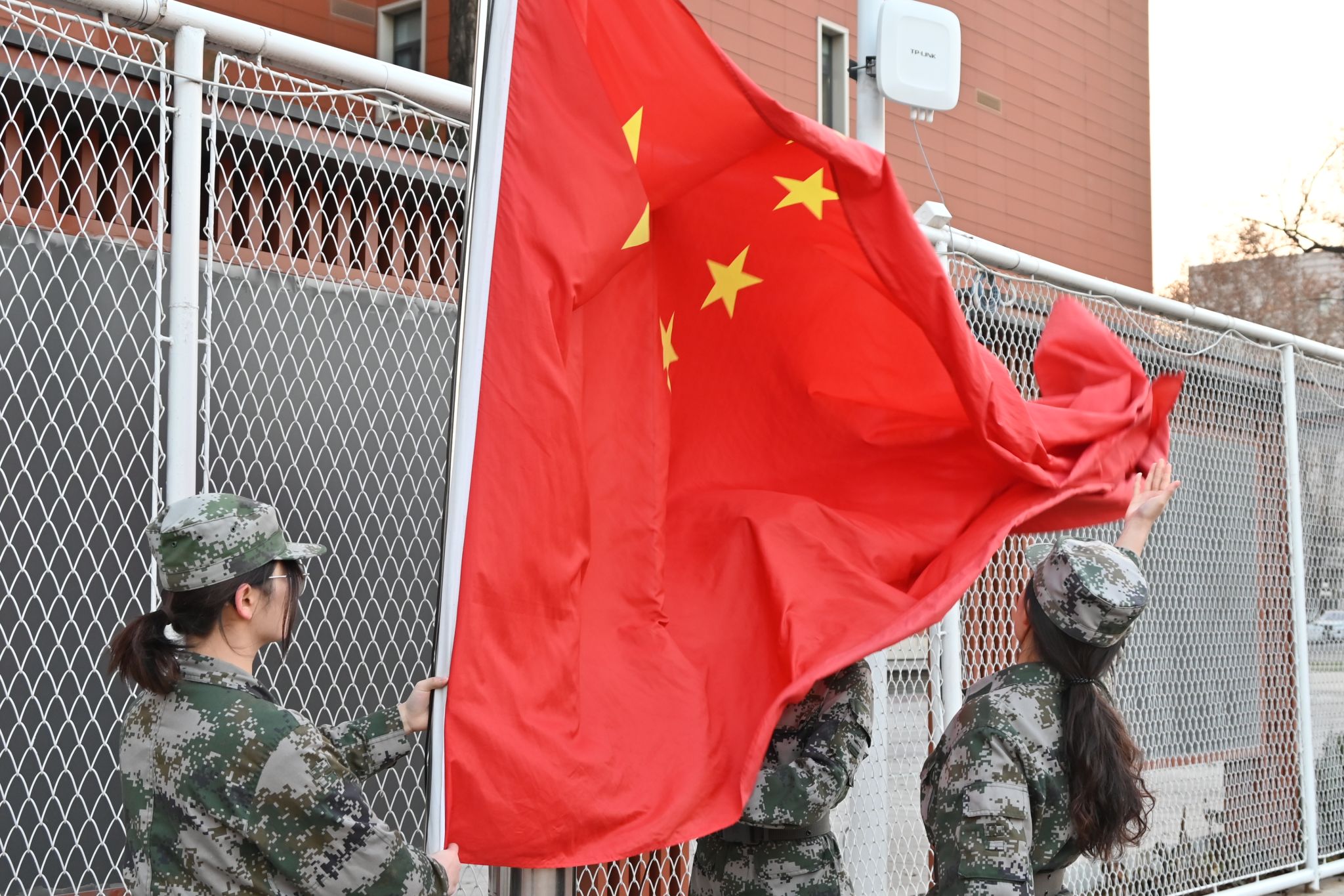 7点30分,升旗仪式准时开始。虽是隆冬时节天气寒冷,北京语言大学国旗护卫队的队员们依然精神焕发,动作有力。齐步,摆臂,正步,踢腿,他们以整齐划一、铿锵有力的步伐向升旗台迈进。在庄严的国歌声中,擎旗手将国旗高高扬起。在全场师生满怀敬意的注目礼中,五星红旗伴随着冬日初升的朝阳冉冉升起,现场气氛庄严肃穆,在场的每一位师生心中都满怀着对国旗、宪法的崇敬。