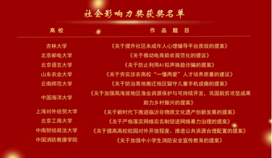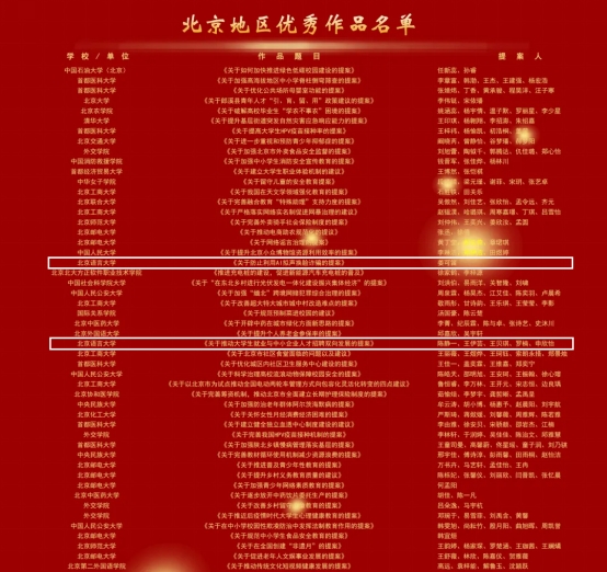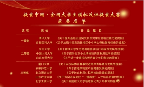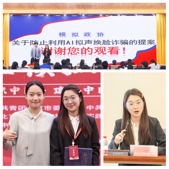 12月1日至3日,由共青团北京市委员会、中共北京市委教育工作委员会、北京市人民政协理论与实践研究会、外交学院主办的“第十届提案中国·全国大学生模拟政协提案大赛”在中央社会主义学院举办。我校学生姜可笛《关于防止利用AI拟声换脸诈骗的提案》在戴慧琦老师的指导下先后斩获“北京地区优秀作品”、全国总决赛“三等奖”、“社会影响力奖”三个奖项;陈静一、王伊芸、王贝琪、罗楠、申欣怡五位同学《关于推动大学生就业与中小企业人才招聘双向发展的提案》在邹泺铱、张政两位老师的指导下斩获“北京地区优秀作品”奖项。