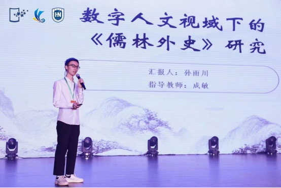 年会现场,经答辩、评审,“数字人文视域下《儒林外史》结构及文本可视化研究”获评“优秀学术论文”(全国仅20篇),团队成员孙雨川同学作为全国四位优秀学术论文代表之一做汇报交流与展示。这是大创年会改革以来学校首次获得该奖项,也是本届年会唯一获奖文科论文。